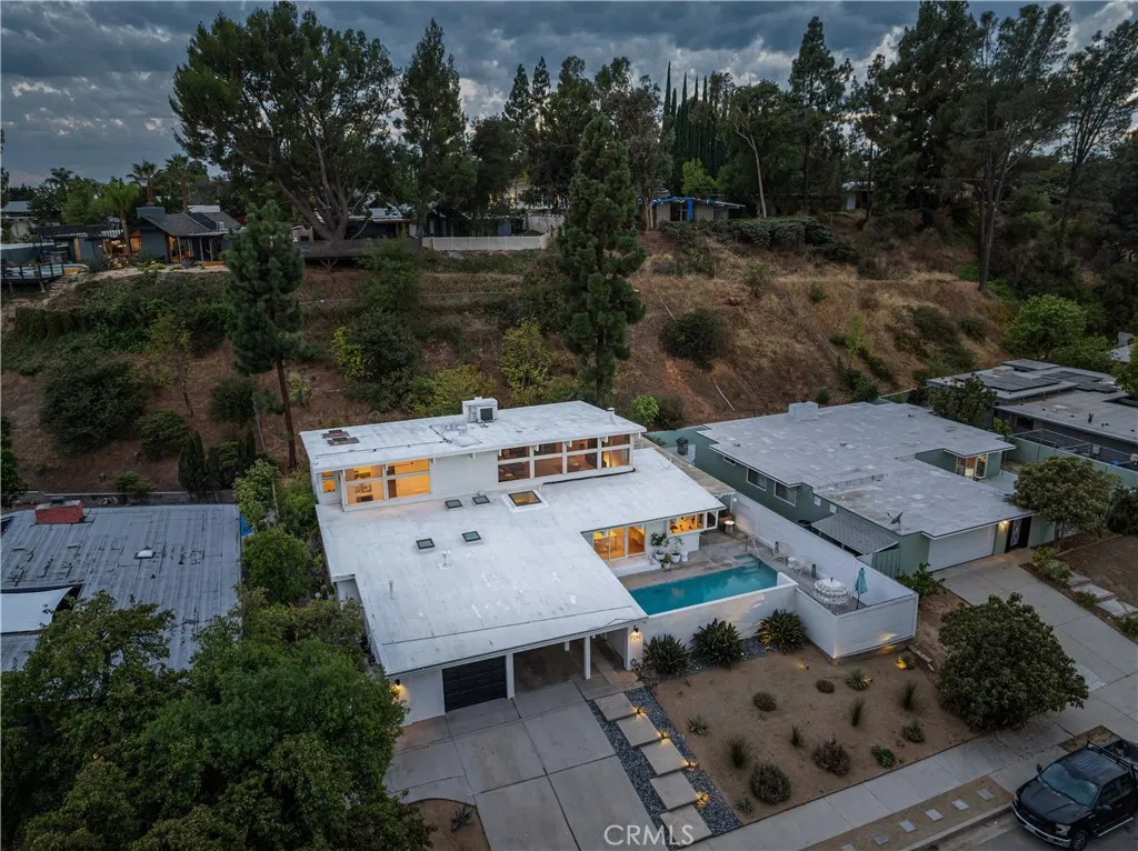 Stunning Mid-Century Modern home echoing the iconic Eichler architecture in the highly desirable Balboa Highlands community. One of the largest and most striking models, this modern architectural gem features an open floor plan that seamlessly connects indoor and outdoor livingperfect for entertaining and everyday relaxation. The home offers 5 spacious bedrooms, including two primary suites (one on each level), each with spa-like baths and large walk-in closets. The gourmet chefs kitchen opens to a casual dining area and spacious living space. Upstairs, a large family room or home theater showcases beautiful mountain views. Enjoy this private oasis complete with a sparkling pool and multiple areas for lounging and dining as well as drought-resistant desert landscaping. Conveniently located near top-rated schools, easy freeway access, and OMelveny Park with its scenic hiking trails. A rare opportunity to own a true mid-century modern masterpiece in one of the Valleys most sought-after neighborhoods.