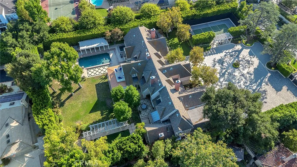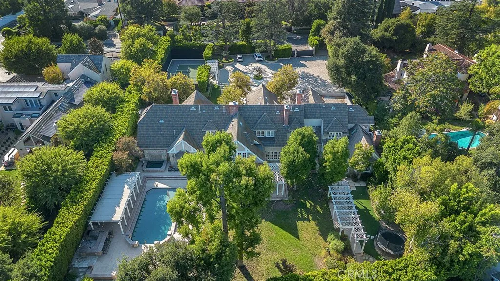 Welcome to this stunning south-of-the-boulevard gated estate, sitting on over one flat acre in the heart of Encino. As the dramatic gates open, youre greeted by a 30-car cobblestone motor court that sets the tone for this 9,200 sq. ft. residence. To the south, youll find a lit sports court striped for pickleball the perfect spot for daily matches and weekend fun. The front-facing four-car garage offers abundant storage space, attic access, and is prepped for EV charging. Step through the grand glass entry doors into an entertainers dream home, designed for large gatherings, holidays, and unforgettable parties. The main level offers a huge sunken dining room, a warm and cozy library, a formal living room, and a lively bar room all opening to the backyard for a seamless indoor-outdoor experience. The chefs kitchen boasts soaring ceilings, top-of-the-line stainless steel appliances, two sub-zero refrigerators and freezers paneled to match the kitchen, and a connected family room, perfect for homework, game nights, and casual hangouts. The laundry area leads to a home office, full bathroom, and guest quarters, ideal for long-term visitors or staff accommodations. The 1,600 sq. ft. primary suite is a retreat in itself, with high-pitched ceilings, a separate sitting room or gym/nursery, a spa-like bathroom with a sunken tub, and a spacious walk-in closet. Just outside the suite is a 1,300-bottle temperature-controlled wine room, accessible from both inside and outside the home. Upstairs, a dramatic staircase leads to three generous secondary bedrooms, each with an en-suite bath