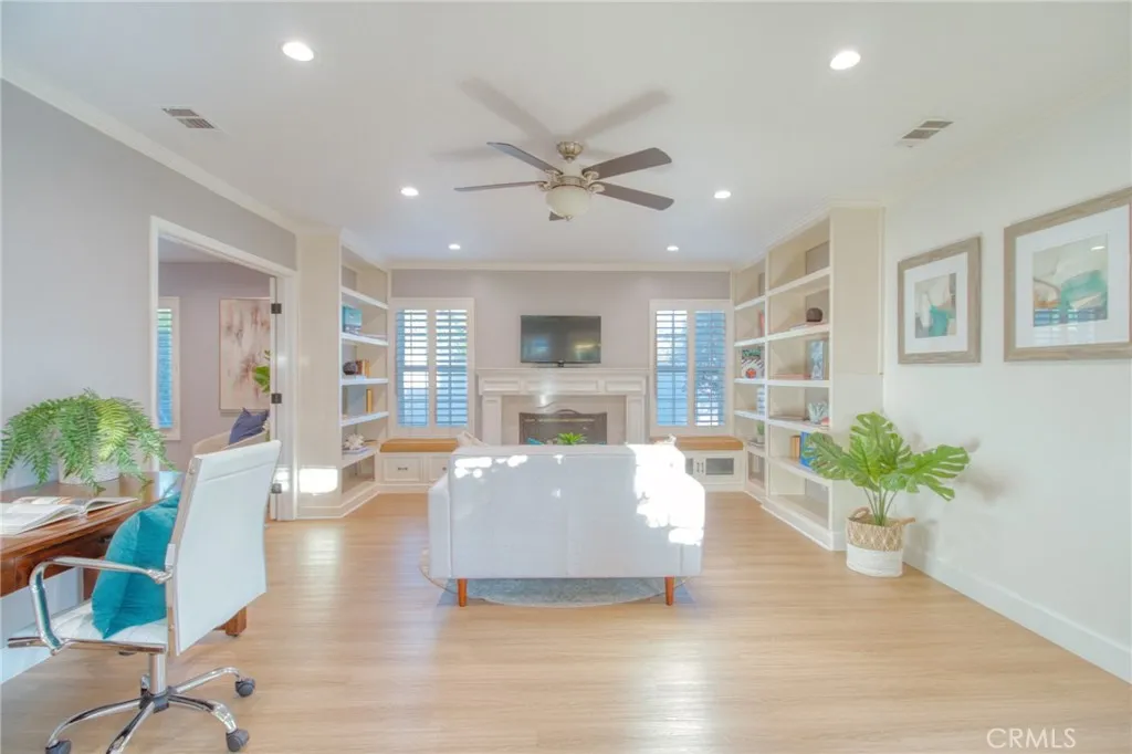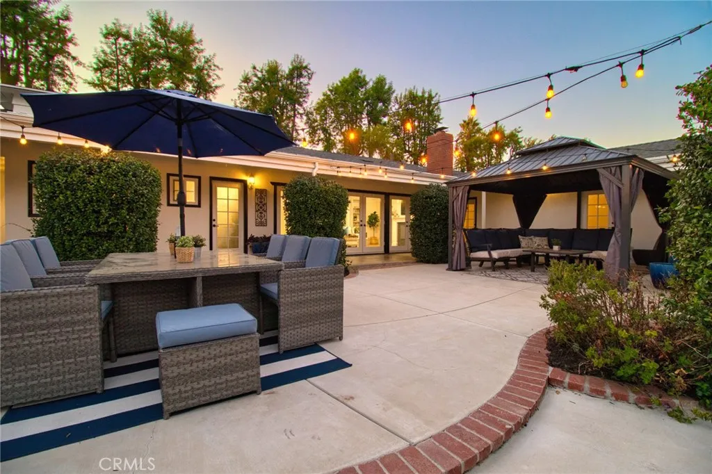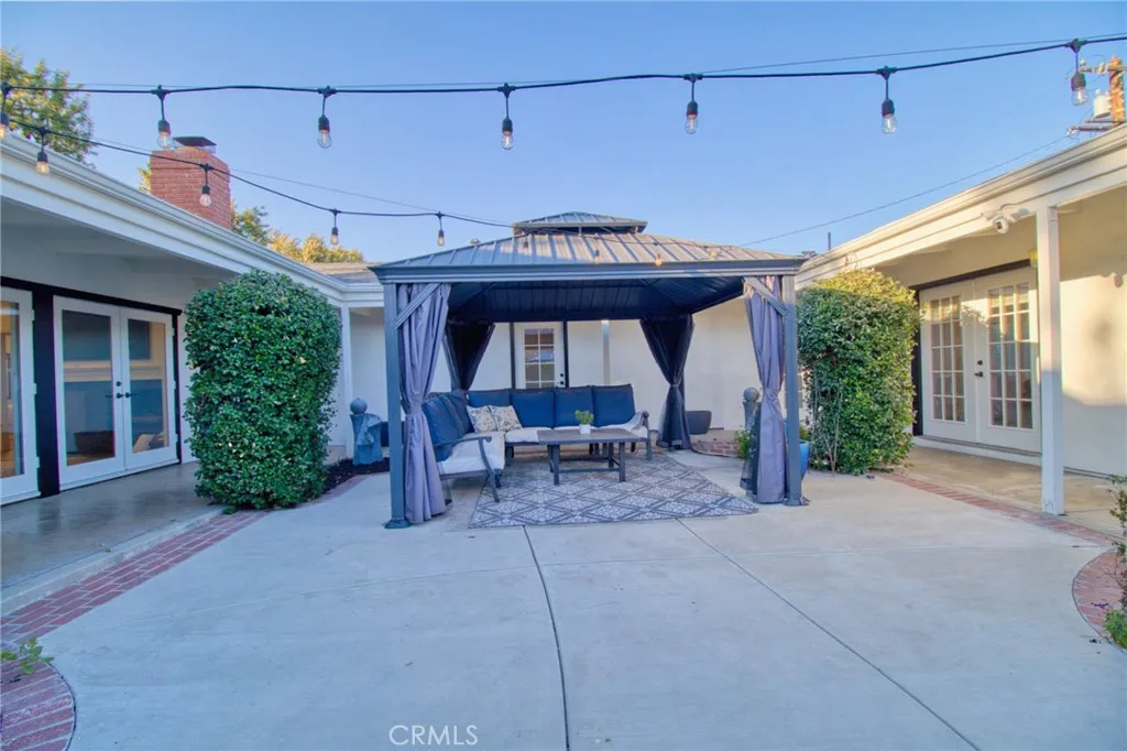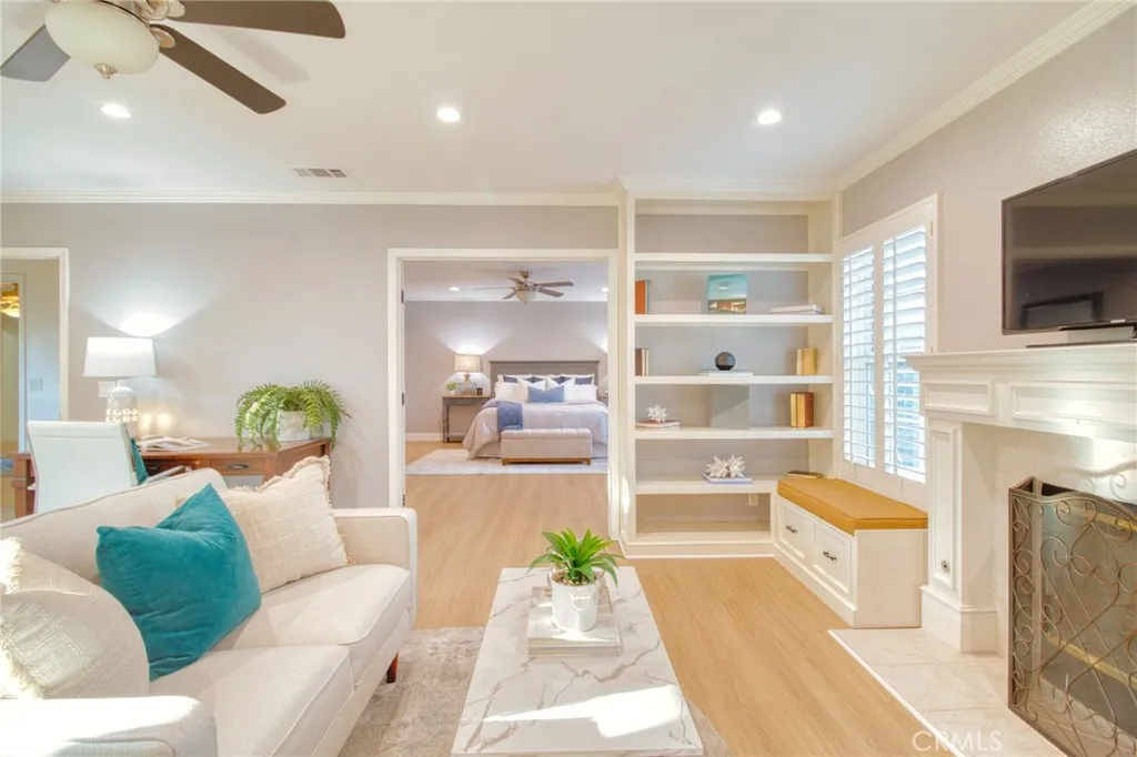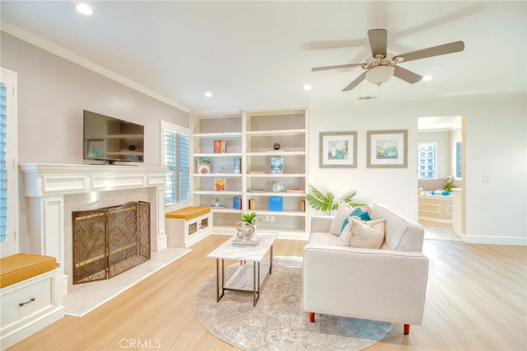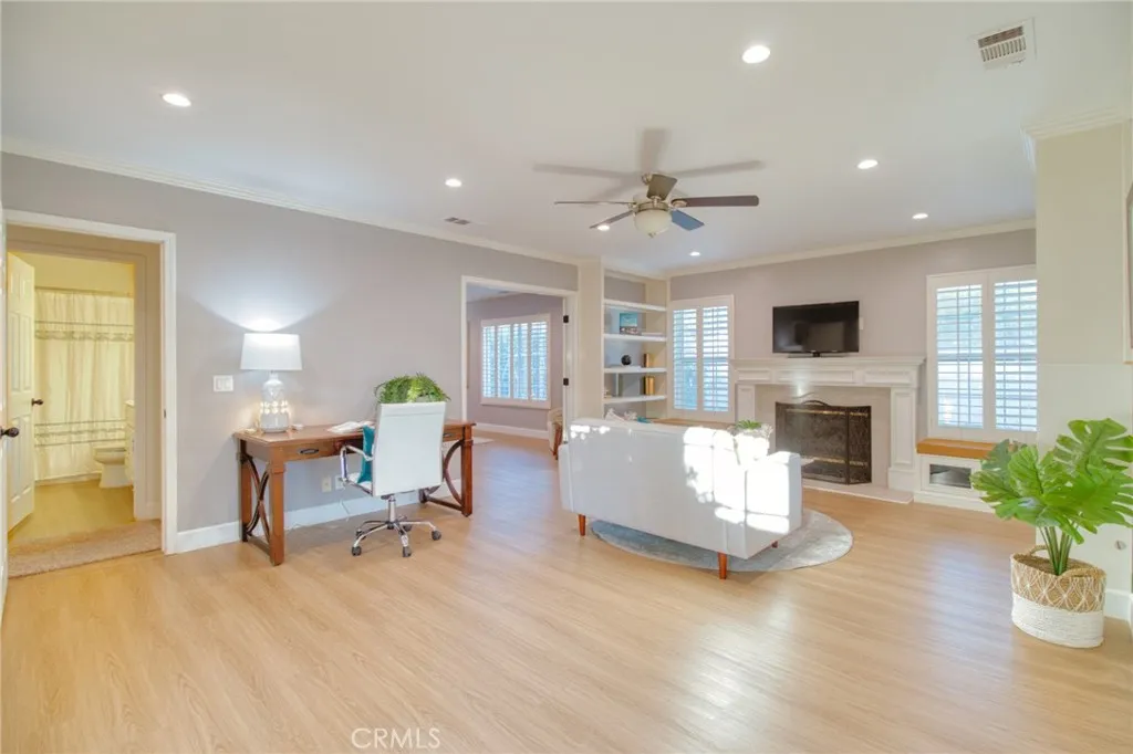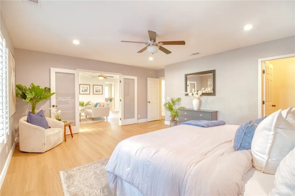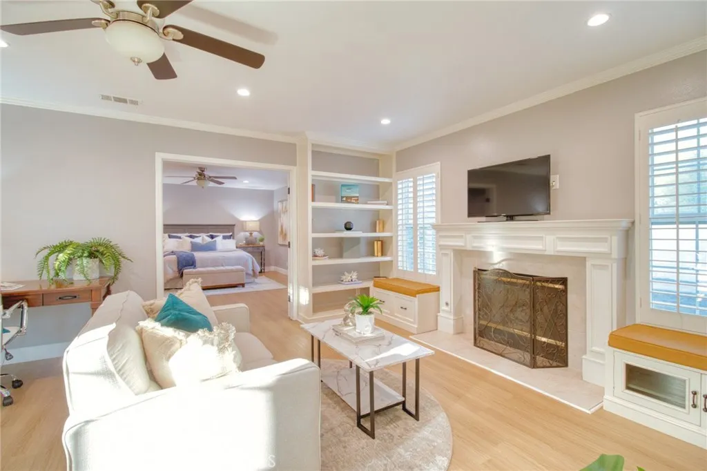 Welcome to this gorgeous, freshly painted exterior ranch style home on an over 17,650 sqft lot in the heart of Upland. Upon arrival an exceptional curb appeal and beautiful brick walkway leads directly to the inviting front porch. Inside, 3,500 sqft of living space with 5br. 4 1/2 bath. Natural vinyl flooring and an open layout ensure easy movement between rooms, along with an abundance of natural light. The kitchen is designed for both functionality and style, ample cabinet space, quartz countertops with elegant backsplash. It is equipped with a white farmhouse sink, stainless steel countertop burner, built-in oven and microwave, Bosch dishwasher, Samsung refrigerator, and a wine cooler. Under-cabinet lighting adds convenience and visibility. A separate laundry area is situated nearby for additional practicality. The kitchen also includes a breakfast nook and bar seating, perfect for casual meals. The adjacent formal dining area is appointed with a built-in China cabinet and connects seamlessly to the formal living room, which is centered around a fireplace and bookcase, and features French doors that open to a courtyard, providing effortless indoor/outdoor access. The home is designed to offer comfortable living and entertaining spaces for both everyday life and special occasions. The primary suite has its own private retreat, complete with a dedicated room featuring a fireplace and bookcase. It offers walk-in closets with custom organization systems and vanity. The suite includes a large shower, spa-style bathtub, and direct access to the central courtyard, creating a re
