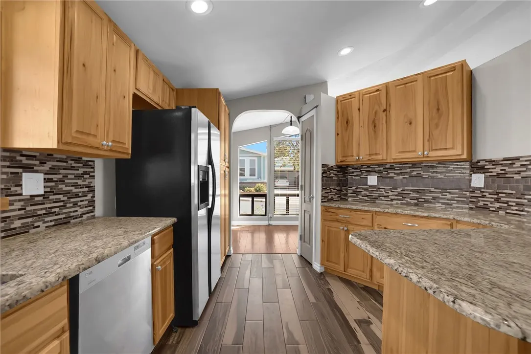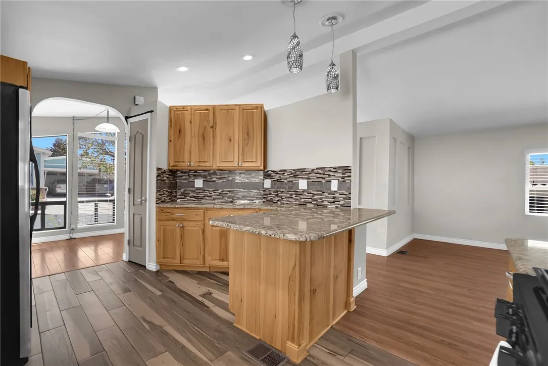 This beautifully restored 2-bedroom, 2-bath manufactured home with a rare 2-car garage offers modern comfort, thoughtful upgrades, and a vibrant lifestyle. Nestled in a well-maintained senior community that radiates pride of ownership, this home is move-in ready with plenty of charm and functionality. Step inside to discover a spacious, remodeled kitchen featuring stunning granite countertops, natural wood cabinetry, and wood-look tile floorsperfect for cooking and entertaining. The large dining room flows effortlessly into the inviting living area with high-quality laminate flooring, ideal for everyday living or hosting guests. Both bathrooms have been tastefully updated with granite countertops, tile flooring, and modern fixtures. The master suite includes dual sinks, a beautifully tiled walk-in shower and tub, and a generous walk-in closet. Both bedrooms offer upgraded carpeting and ample space for comfort and relaxation. Additional highlights include: Energy-efficient Anlin dual-pane windows (south-facing) Recently replaced AC unit Spacious laundry room with extra storage and room for a freezer Lovely landscaped yard with a covered patio, perfect for enjoying beautiful evening sunsets Fruit trees and garden space including orange, lemon, roses, and a mature grapevine Enjoy the perks of a low HOA that includes trash service and basic Cox cable. The active community features a clubhouse with a commercial kitchen, large gathering spaces, library, billiards room, heated pool, spa, shuffleboard, BBQ area, and shaded seating. A fitness center and additional meeting rooms