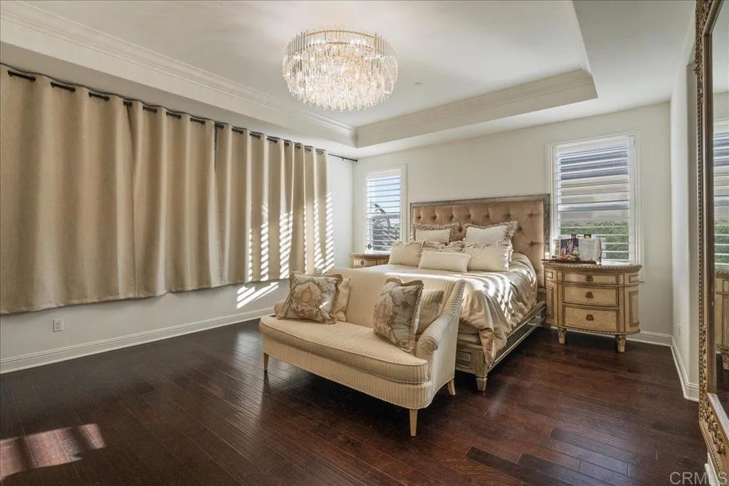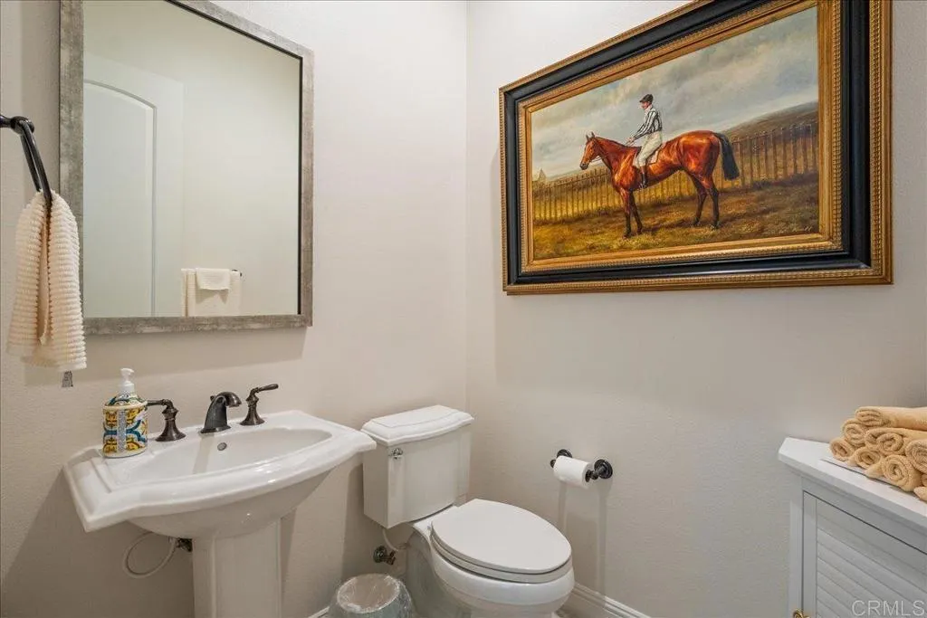 Discover refined living in this exquisite 6-bedroom estate, tucked within the exclusive gated community of Robertson Ranch. Blending sophistication and comfort, this residence showcases soaring ceilings, impeccable architectural details, and exquisite designer finishes throughout. Step inside to find an elegant mix of Carrara Gioia marble, Jurastone Beige tile, and rich hardwood flooring, creating a seamless flow of luxury and warmth. The chefs kitchen serves as the heart of the home, featuring premium finishes and thoughtful craftsmanship ideal for both entertaining and everyday living. Just off the kitchen, the family rooms glass doors invite natural light and open to the backyard, offering an effortless connection to the outdoors. The primary suite, conveniently located on the first floor, offers a serene retreat of comfort and style. Dual laundry rooms on each level add exceptional convenience. Step outside to your own private retreatwhere serene bluff views frame the luxury pergola, built-in BBQ and a breathtaking custom fountain that anchors the expansive patio. The home is also equipped with solar for modern efficiency and ease. Enjoy resort-style community amenities, including a sparkling pool and spa, elegant clubhouse, beautifully maintained parks, and more. Perfectly positioned just 3 miles from the beach, with access to top-rated schools and nearby shopping and dining, this extraordinary property embodies the very best of Carlsbad luxury living.