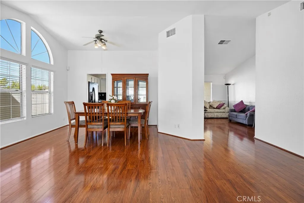 This single-story West Palmdale corner home is in the desirable Rancho Vista community! This 4 bedroom, 2 bathroom home is 1,666 SF, built in 1995 and on a 7,103 Lot. As you enter youll notice all the natural light and the beautiful laminate flooring, spacious living room with fireplace and dining room with ceiling fan. The adjacent kitchen features granite countertops, newer appliances, garden window that looks out to the backyard, breakfast counter that opens to the family room with sliding door to the backyard patio. The primary bedroom and attached bathroom has dual sinks and a sliding door to the backyard. All four bedrooms are carpeted. There is a hall bathroom with a shower in the bathtub.There is an indoor laundry room leading to the 3-car garage with good storage. The spacious backyard features a vinyl fence. Additional features: Refrigerator (2023), dishwasher (2024), stove (2024) and microwave (2024), HVAC (2022), water heater (2023) and vinyl fencing (2021). Close to Marie Kerr Park, Rancho Vista golf course, Amphitheatre, Antelope Valley Mall, Highland High School, walking trails, shopping, restaurants, 14 freeway and more!