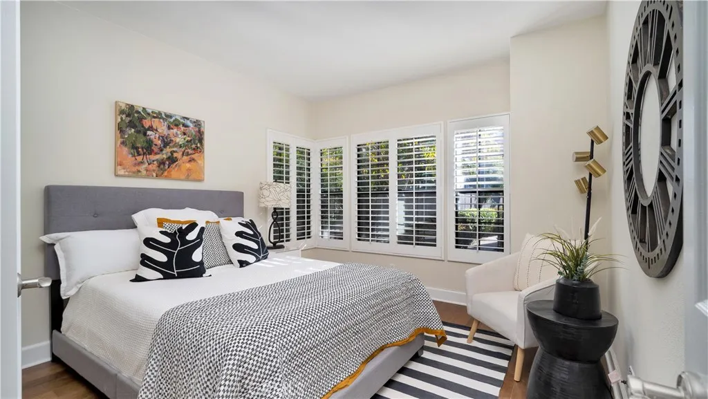 This stunning single-story home is one of the most beautiful on the market this year! Freshly painted inside and out, it boasts an airy, modern feel thanks to open walls and flowing spaces. Warm and inviting, it features a private wraparound garden and patio, paired with a charming Craftsman style and rich, elegant details. Dramatically high ceilings, crisp corners, and tall columns give the Ashford design its timeless contemporary look. Slate and wide-plank hardwood floors run throughout, complemented by custom cabinetry. The slate fireplace with built-in shelves and bookcases is the perfect place to unwind, with garden views framed by shuttered windows. Custom sliding doors open to the private patio. Both bathrooms have been remodeled with exceptional taste and quality, including a luxurious slate walk-in shower in the primary suite. The spacious kitchen dazzles with abundant storage, stone counters, and thoughtful custom details, along with premium appliances like a Samsung French door fridge, Whirlpool dishwasher, Frigidaire dual wall ovens, and a 5-burner gas cooktop. Located in the picturesque Pinewood neighborhoodfamous for its winding roads and magnificent treesresidents enjoy a neighborhood pool, jacuzzi, park, volleyball court, and picnic area. With festive holiday decorations and friendly gatherings, its a wonderful place to make friends and truly feel at home. The Woodbridge Village Association has recreation amenities that are unmatched in their breadth and scope when compared to similar private Homeowner Associations. The amenities include 2 landmark lakes wit