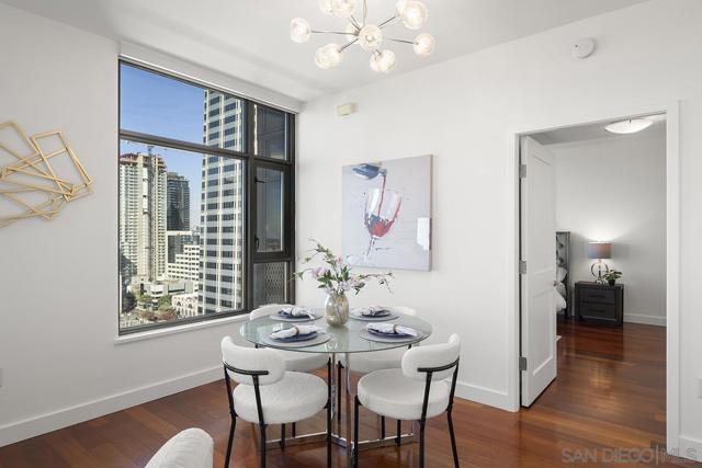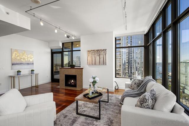 Don’t miss this fabulous northwest corner residence at Electra, well maintained for the discerning buyer! Showcasing Bay, Point Loma, and cityscape views from the many windows as well as the private balcony: the ideal place for trademark sunset evenings. The desirable split-bedroom layout is complemented by engineered cherry wood flooring, track lighting, and an ambient fireplace in the living room, creating a comfortable retreat above the city. Enjoy sit down meals in the dining area while the kitchen features granite countertops, stainless appliances, and recessed lighting, making it perfect for both everyday living and entertaining. The primary suite enjoys gorgeous views and an ensuite bath with dual vanity, step-in shower, and deep soaking tub. The second bedroom offers a built-in executive desk area and easily functions as a guest room, office, or flex space. Additional highlights include custom Elfa closet organization throughout, a generously sized utility/laundry room, extra storage space, and two parking spaces (tandem). Offering a fabulous location in the coveted Columbia District, you will love being only a short walk to Waterfront Park, Seaport Village, The Headquarters, vibrant Little Italy, and much more. Offering a fabulous location in the coveted Columbia District, you will love being only a short walk to Waterfront Park, Seaport Village, The Headquarters, and the brand-new Rady’s Shell at Jacobs Park, a unique live music venue and home of the San Diego Symphony! Also enjoy proximity to the future life science and biotechnology research development The Research and Development District (The RaDD) at the Embarcadero and the sustainable tech-focused Horton Plaza Redevelopment in the center of the city. Electra has the unique distinction of being built around the historical 1928 SDG&E Station B. Residents can take advantage of an array of services including a concierge, security, and guest parking spaces available by reservation through a simple mobile app. Unwind and relax in the steam room or sauna, resort-style pool and spa, fitness center, and Electra Park on the 5th floor surrounded by lush landscaping and a romantic outdoor fireplace and top-of-the-line barbecues.