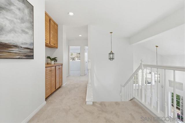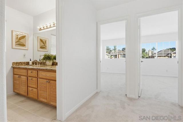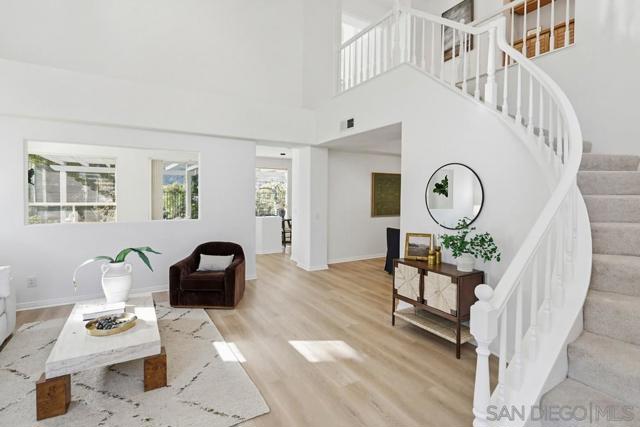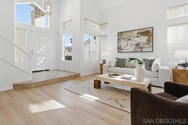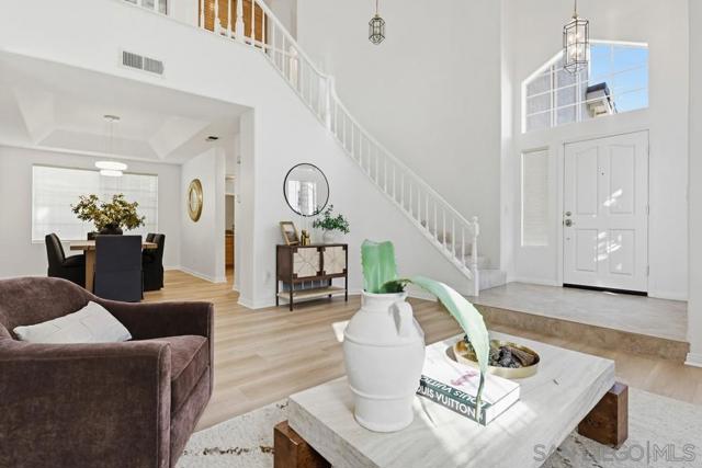Nestled in the sought-after Carmel Mountain Ranch community, this gorgeous home is impeccably maintained and radiates a sense of style, comfort, and practicality. Inside, an open floor plan bathed in natural light showcases soaring ceilings and brand-new premium plank flooring. Freshly painted neutral walls provide the perfect canvas for your personal touch. The updated kitchen shines with granite countertops, travertine tile, new stainless-steel appliances, and a cheerful breakfast nook that opens to a serene, private backyard—ideal for morning coffee or summer barbecues. Upstairs, the tranquil primary suite offers a peaceful retreat with high ceilings, a walk-in closet, and a spa-like en-suite featuring a soaking tub, glass-enclosed shower, and elegant finishes. Additional spaces include a cozy family room with a charming fireplace and practical upgrades like a newer HVAC system and water heater for long-term comfort. Located minutes from shopping, dining, top-rated Poway Unified schools, and major freeways like I-15 and SR-56, convenience is key. With thoughtful updates, impeccable care, and a prime location, this home is a rare gem ready to be yours!