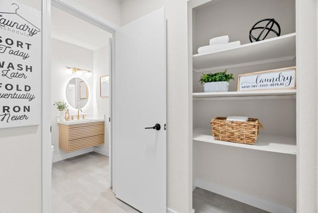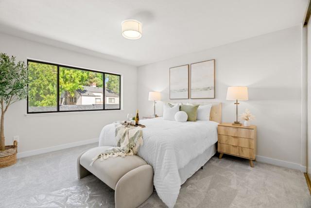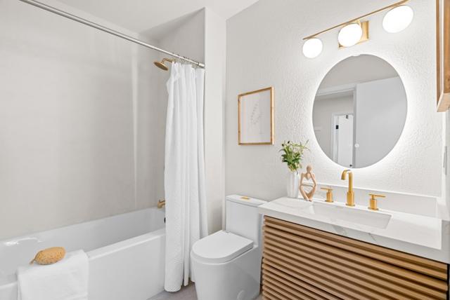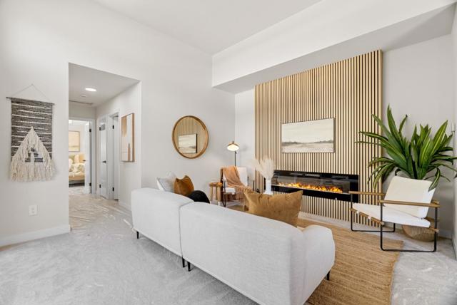 Imagine morning walks through Townsend Park, then coming home to your own light-filled sanctuary. This 2-bedroom, 1-bath condo isn't just updated. It's transformed. Soaring vaulted ceilings flood the great room and kitchen with natural light, creating an airy backdrop for daily life. The kitchen dazzles with quartz countertops and matching backsplash, sleek cabinetry, and waterproof flooring. The fully permitted bathroom brings spa-like luxury with brushed gold fixtures, a contemporary vanity, and luxury vinyl flooring. Your great room centers around a stunning custom feature wall with wood-slat accents and a built-in electric fireplace, pre-wired and ready for entertaining. Fresh designer paint, plush new carpet, sleek lighting, and premium finishes throughout mean you can simply unpack and start living. A rare dedicated laundry room inside, private balcony, and ground-level garage make everyday life effortless. Enjoy the community pool, nearby green spaces and courts, plus minutes to 101/880, SJC Airport, and Silicon Valley's top employers. This one won't last long. Come see what makes it special.