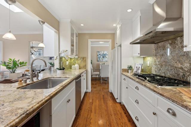 Beautifully maintained home captures breathtaking views from both indoor and outdoor living spaces. Attractive curb appeal featuring stamped concrete driveway, brick accents and mature landscaping. Tile entryway leads to spacious living room with marble-surround fireplace and large windows. Formal dining room highlighted by crown moulding, board-and-batten detail, vintage-style chandelier, and bay window with bench seating and scenic views. Comfortable family room with sliding glass door to the backyard. Updated kitchen open to the family room, offering granite countertops with breakfast bar, large eating area, and stainless-steel appliances. Primary suite with plush carpeting, mirrored closets, bay window with views, and ensuite bath with walk-in shower. Two additional bedrooms with carpeting and ample closet space, one with bay window and views. Hall bath with tile flooring and shower-over-tub. Backyard retreat with stone patio, multi-level decking, gazebo, and unobstructed views of the neighborhood hills, SF Bay, and Mt. Diablo. Attached two-car garage with laundry area, utility sink, and storage cabinets. Wonderful location close to Bayhill Shopping Center, Junipero Serra and San Bruno Parks, Highway 280 and 380 access, and San Bruno and Millbrae BART& Caltrain Station.