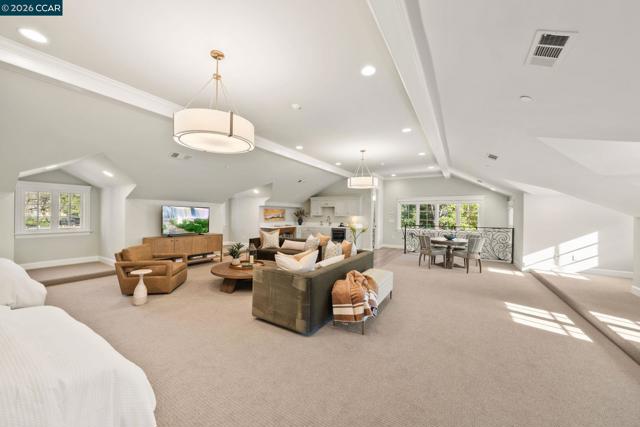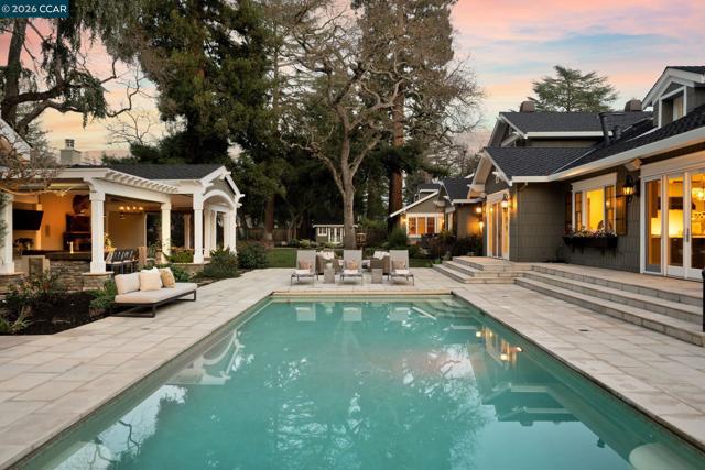 An iconic gated estate on prestigious Alameda Diablo, offering timeless craftsmanship and refined country club living. Backing directly to the fairways of Diablo Country Club with a private entry with fountain, manicured lawn, and pergola-framed porch sets the tone. Inside, soaring 12-foot ceilings and curated interiors blend warmth and elegance. The chef’s kitchen features marble surfaces and premium appliances, opening to the family room and custom bar, ideal for entertaining. Resort-style grounds include a pool and spa, pool house with sauna, pavilion with full kitchen and fireplace, fire pit, potting shed, and expansive golf course views. The home also offers a custom wine cellar, media room, playroom, bonus room, and private office. The primary suite includes patio access, walk-in closet, and spa-like bath. An upstairs au pair suite with separate entrance provides flexibility. Prime location near Diablo Country Club, trails, downtown Danville, top-rated schools, and freeway access.