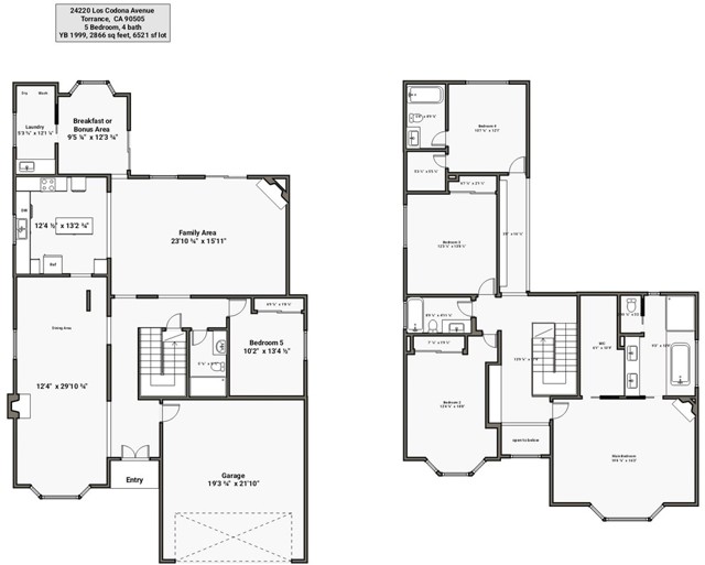Outstanding custom home with great floorplan. 5 bedrooms total with one bedroom on 1st floor next to full bathroom. 4 bedrooms on 2nd level with 3 additional bathrooms. Living room with full dining area plus breakfast room which faces the rear yard and patio. Large family room with high ceiling facing the kitchen. Granite counters in kitchen. 3 marble fireplaces. Master bedroom with fireplace, large walk in closet & full large bathroom. Large rear yard approx 130 feet deep, 6397 sq feet. 2866 sq feet of living area, built in 1999. Photos with furniture are virtually staged to show true potential. Steps from Walteria Park. Nearby shopping & restaurants. Desirable Torrance school district