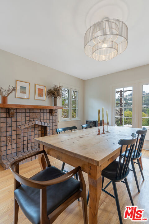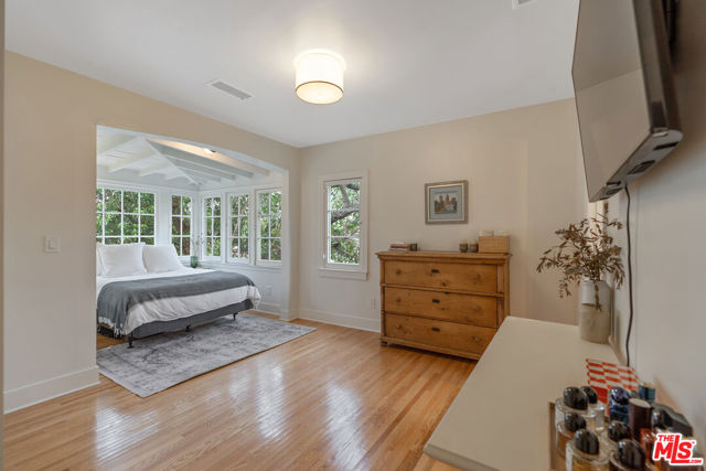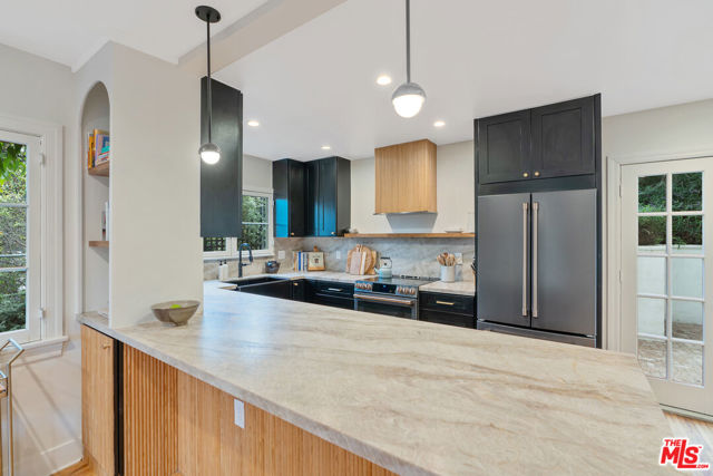 Set in the hillside of Beachwood Canyon, this thoughtfully restored Spanish Colonial Revival residence captures the appeal of its 1924 origins while embracing modern functionality. The home's original bones immediately stand out, from beautiful old windows and Batchelder-style tiled fireplaces to graceful archways and built-in details that reflect the craftsmanship of another era. Positioned high enough to enjoy sweeping views yet still connected to the neighborhood and city below, the home offers a rare sense of calm. Sunrise views from the bedrooms unfold across the canyon, creating a peaceful morning ritual. The thoughtful layout creates a seamless flow to the interior while emphasizing light, space, and views throughout. The interior features a bright, open layout with refinished white oak flooring, restored original windows and doors, and fresh interior and exterior paint. Recessed lighting enhances the main living areas and primary suite, while curated fixtures and architectural details add warmth. The kitchen blends performance and design with Taj Mahal leathered quartzite countertops, new soft-close cabinetry, and gorgeous Energy Star appliances, including a GE Cafe range, refrigerator, dishwasher drawers, and an LG washer and dryer. A vintage Murano chandelier adds a distinctive entry moment. Major systems have been updated, including a new roof with a 20 year warranty, a two-zone energy-efficient HVAC system with smart thermostats, an energy-efficient electric water heater, updated plumbing and electrical, a new electrical panel, foundation bolting and structural reinforcement, and a newly lined sewer main with a 25 year guarantee. Outdoor living extends the home's design with French drains, drought-tolerant landscaping with drip irrigation, exterior utility hookups for a future patio kitchen, a custom front entry gate, and a custom mahogany garage door. The terraced garden and patio create a private backyard oasis. Located in a scenic hillside setting with convenient access to Gelson's, The Oaks Market and Cafe, dining, cultural destinations, and outdoor amenities, this residence offers classic Los Angeles architecture enhanced by thoughtful upgrades, views, and a seamless indoor-outdoor connection.