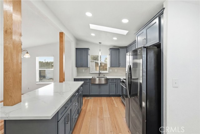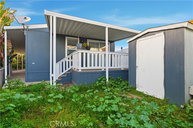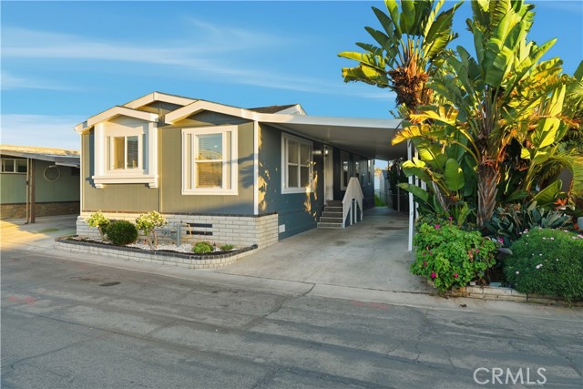 Welcome to this charming and move-in-ready manufactured home located in a well-maintained all-age community featuring a clubhouse, swimming pool, and fully equipped gym. The home offers a bright, open-concept layout with vaulted ceilings, recessed lighting, and abundant natural light throughout. The spacious living area flows seamlessly into the kitchen, showcasing newer wide-plank wood flooring that adds warmth and a modern touch. The updated kitchen features stylish gray cabinetry, quartz countertops, a center island with seating, stainless steel appliances, and a beautiful tile backsplash—perfect for entertaining or everyday living. Skylights and large windows enhance the airy feel of the space. The exterior boasts excellent curb appeal with fresh gray siding, white trim, a covered carport, and mature tropical landscaping that creates a welcoming entrance. The private driveway and covered patio area provide convenient parking and outdoor enjoyment. Located in a friendly, well-kept community offering resort-style amenities including a clubhouse, pool, and fitness center, this home combines comfort, style, and affordability. Perfect for first-time buyers, families, or anyone looking for a low-maintenance lifestyle in a central location—this home is truly a must-see!