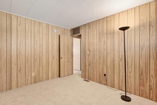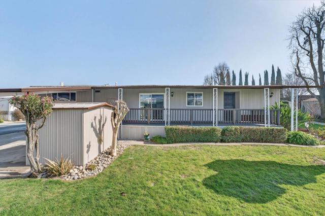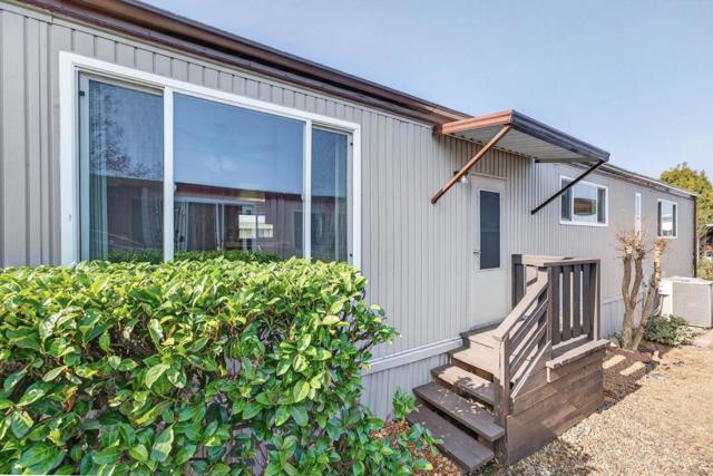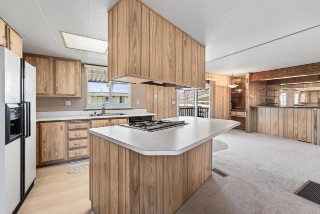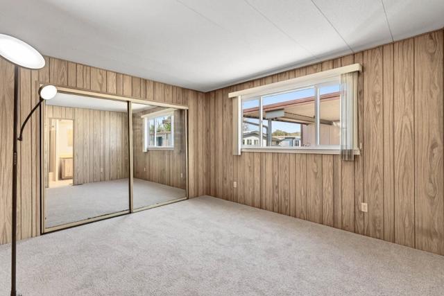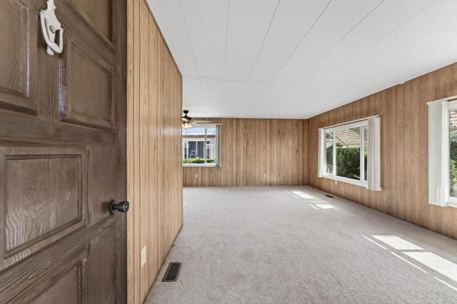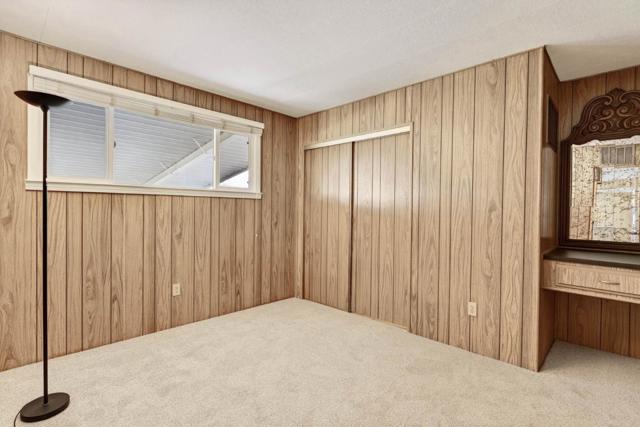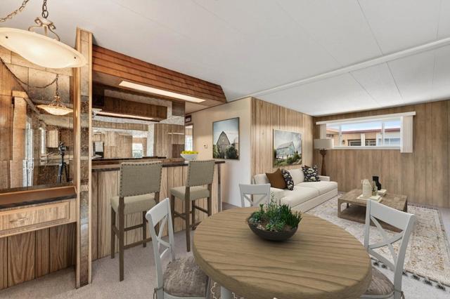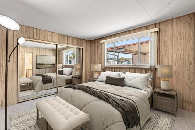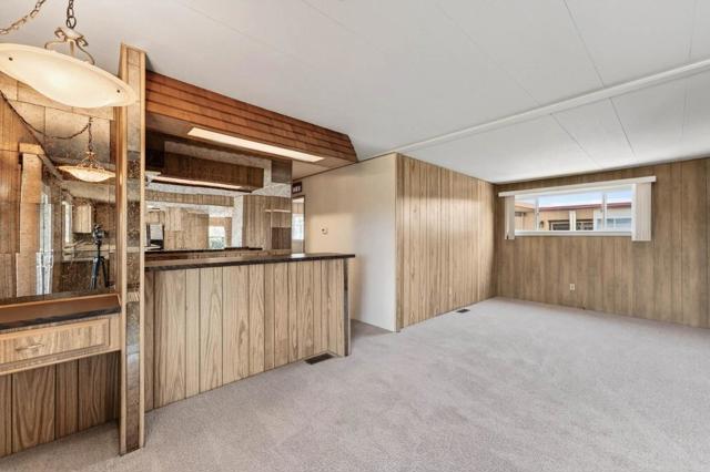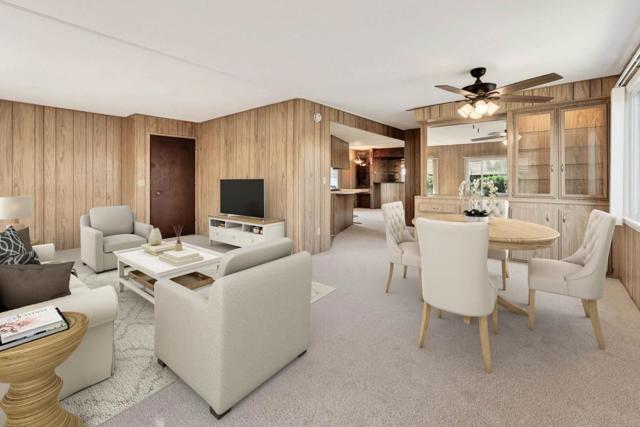 If you love vintage character with modern comfort, this is a must see! Thoughtfully refurbished while preserving much of its original charm, a rare blend of retro character and modern livability. Enter from the new deck with redwood steps, overlooking a peaceful greenbelt and walking path. The open-concept living area features classic paneling, new carpeting, updated windows, and a built-in hutch with integrated lighting that creates an inviting dining space. Fresh exterior paint enhances the homes curb appeal and pride of ownership. Originally designed as a 3-bedroom, one bedroom wall was opened to create a spacious family room area and can be reinstalled if a third bedroom is desired. The updated kitchen offers refreshed finishes while maintaining timeless style, including fresh interior paint, tasteful wallpaper accents, oversized island with gas oven range, expansive pantry, and a vintage wet bar with decorative gold vein mirror panels. The primary suite features mirrored closet doors and an attached bathroom with dual sinks and mirrors and a walk-in shower. Additional features include an interior laundry room with washer and dryer included, refrigerator included, storage shed, and side-by-side two-car covered carport. Well maintained and move-in ready.