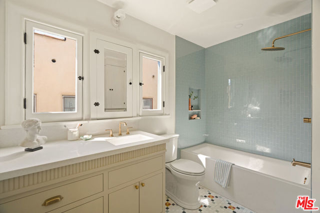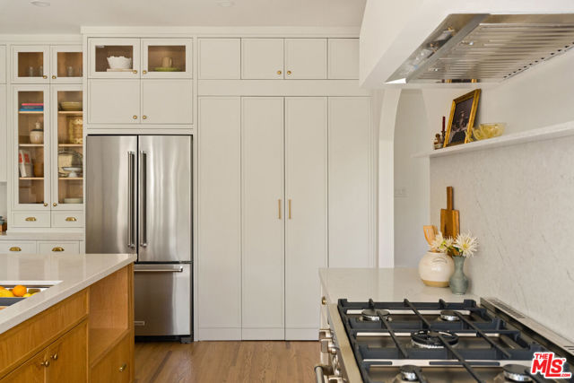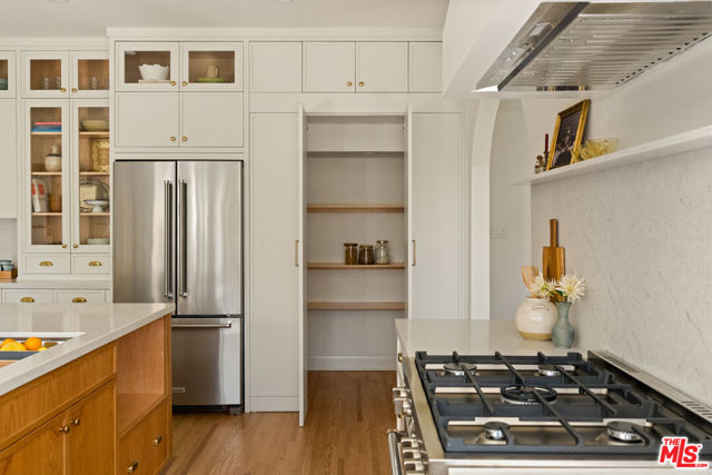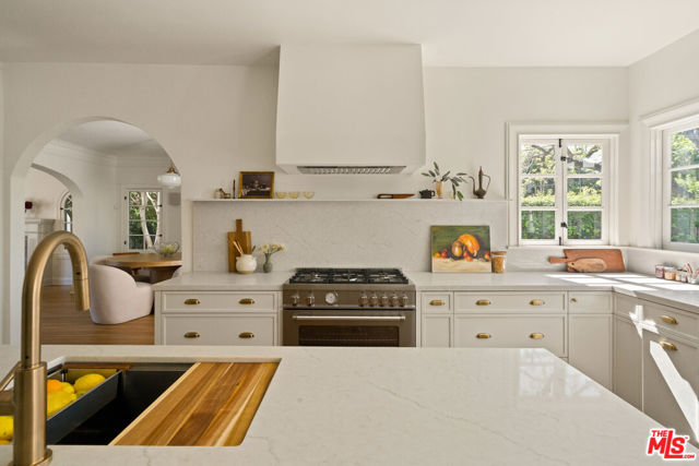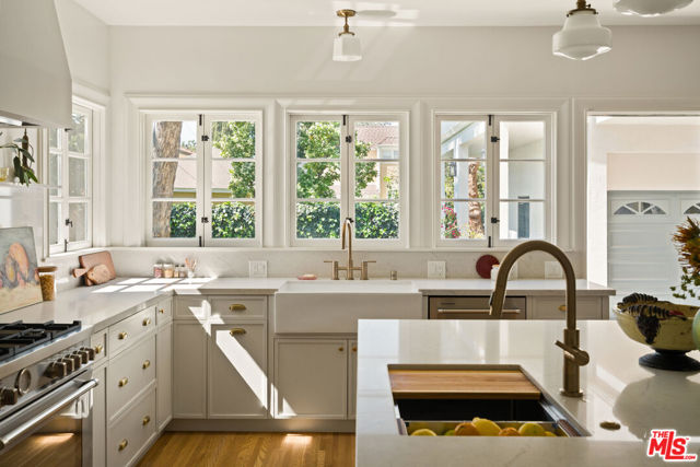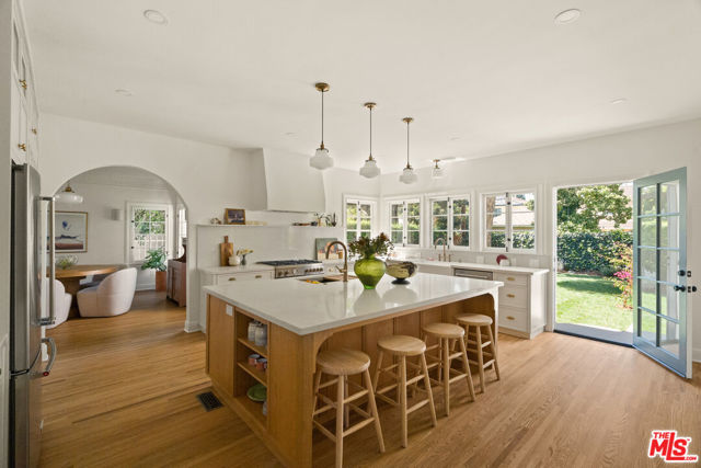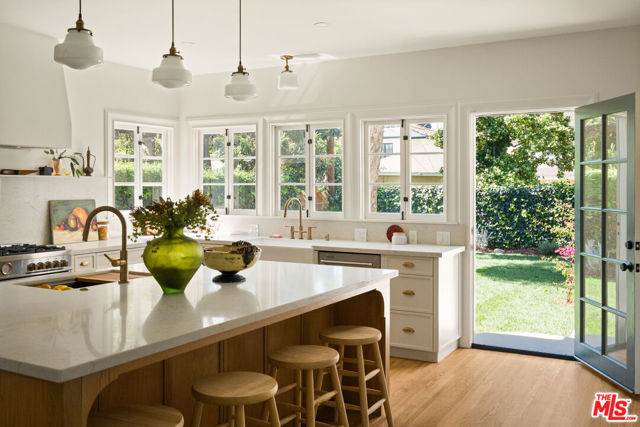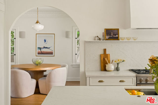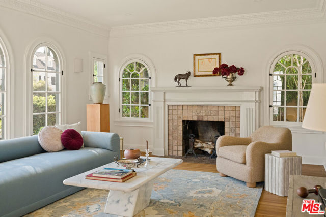 Step into timeless elegance with this stunning 1923 Spanish architectural gem situated in the heart of Windsor Village HPOZ, adjacent to esteemed Hancock Park. This home features distinguished period details, including soaring ceilings, exquisite moldings, arched casement windows, and an original Batchelder tile fireplace, collectively establishing an atmosphere of enduring sophistication. The well-appointed cook's kitchen features an oversized white oak island, Bertazzoni stove, abundant storage, dual sinks, a walk-in pantry, and custom cabinetry, all complemented by serene views of the backyard. A generously proportioned formal dining room, bathed with natural light, provides an exceptional setting for distinguished gatherings and entertaining. A ground-floor office overlooks a charming courtyard with a soothing fountain. The upper level accommodates three spacious bedrooms, including a substantial primary suite appointed with a sun-filled bath, walk-in shower, double vanity, and deep soaking tub. An enchanting bridge leads to a versatile recreation room featuring abundant natural light, a three-quarter bath, and a kitchenette ideally suited for extended family accommodations, guest quarters, or a dedicated creative workspace. The peaceful backyard features established mature trees and manicured lawn areas offering a private outdoor retreat. A secured gated entry provides access to a two-car garage with plentiful storage. Around the corner from Harold Henry Park and walking distance to Larchmont Village shops & restaurants. This one has everything that you are looking for!