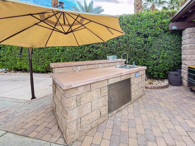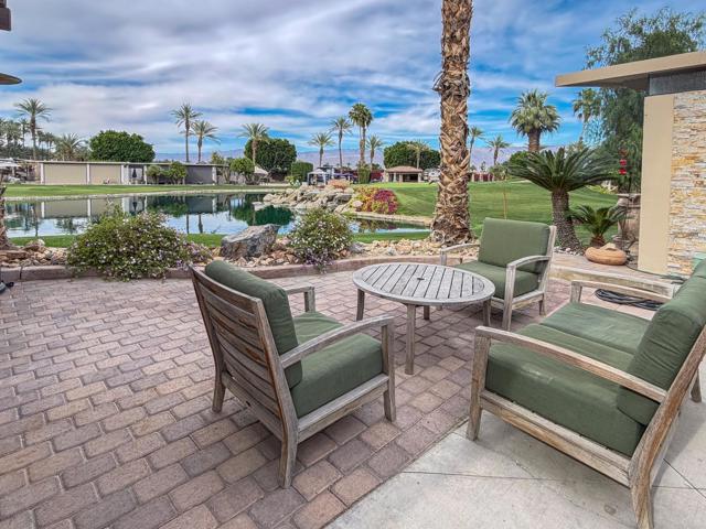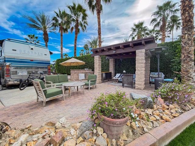 Positioned at the highest point of ORI, this exceptionally private lot is framed with mature hedges, six palm trees, and a citrus tree, creating a peaceful retreat with remarkable views. From the rear of the lot, you face north across the lake toward a large waterfall, with sweeping vistas of the Chocolate Mountains that glow beautifully at sunset -- truly one of the most breathtaking backdrops in the resort.The outdoor living space includes a nicely maintained wood-top pergola with sheet metal roofing and two manual screens for shade and comfort. Pavers and a concrete RV pad provide both functionality and an inviting area to relax and entertain.A convenient simple kitchen counter area offers a sink, garbage disposal, hot water heater, and storage -- perfect for easy outdoor meal prep. Furnishings include a wooden outdoor set with round table, loveseat, and two chairs, an outdoor sofa, a mushroom heater, and both small and large rolling tool boxes for added storage and flexibility.Outdoor Resort Indio is a Class Only RV resort.