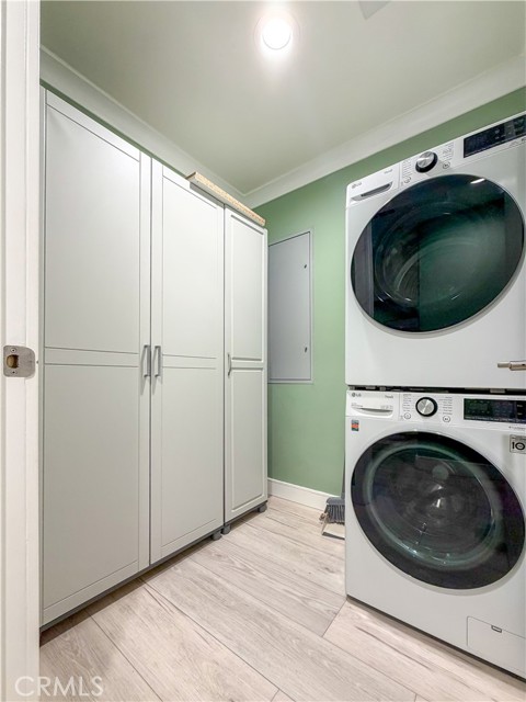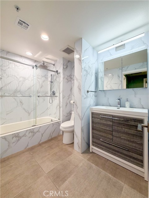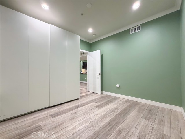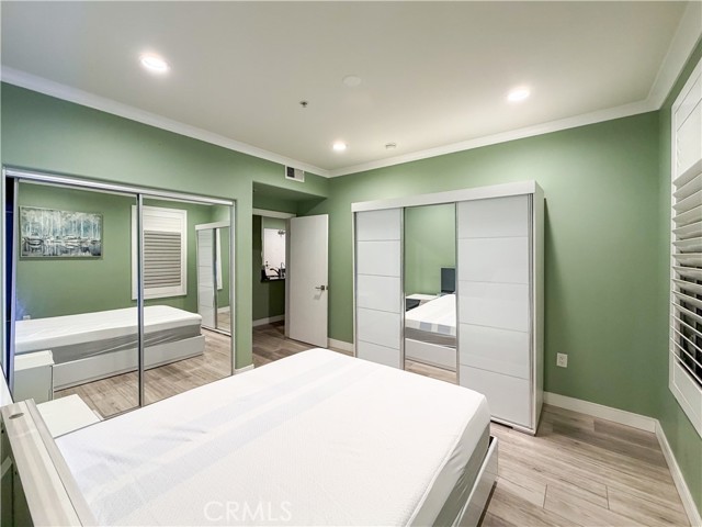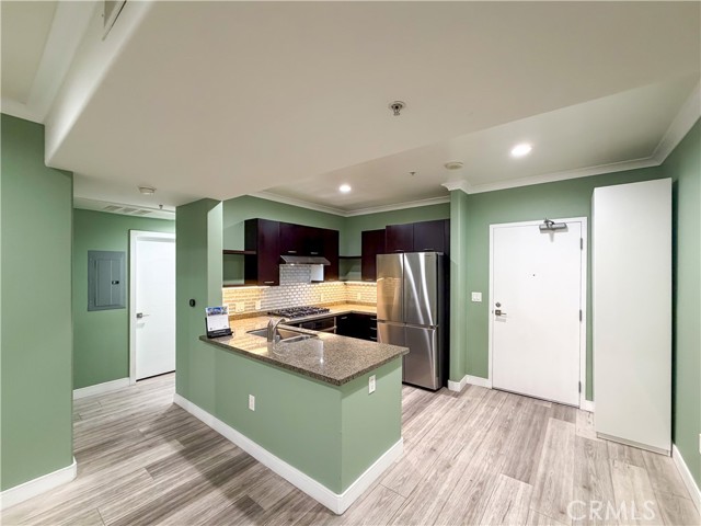 Experience sophisticated condominium living in the highly sought-after Burbank Collection, perfectly positioned in the heart of Downtown Burbank. Located directly across from AMC Theatres, this bright and modern 2-bedroom, 1-bathroom unit spans 920 square feet and features an excellent open-concept floor plan with fresh sage-green accent walls, light wood-look flooring, and recessed lighting. The gourmet kitchen showcases rich dark cabinetry and stainless-steel appliances including a gas range and oven that opens seamlessly to the living and dining areas. The spacious primary bedroom offers a peaceful retreat with excellent natural light while the updated bathroom features elegant marble-look tile, a glass-enclosed tub/shower combination, and a contemporary floating vanity. In-unit stacked washer and dryer add convenience. This pool-level unit offers direct patio access to the sparkling resort-style community pool and lush landscaping. Residents enjoy outstanding amenities including a fully equipped fitness center with cardio machines and weights, putting green, BBQ area, and convenient on-site package lockers. HOA dues cover water, gas, trash, sewer, and basic DirecTV service. This turnkey home includes two side-by-side assigned parking spaces in the gated subterranean garage plus extra storage. Located in a prime Burbank location, this rare opportunity will not last long. Schedule your private showing today!
