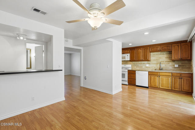 Immaculate and Move-In Ready! Updated and beautifully maintained 3+2.5 townhouse in prime location in Thousand Oaks. Nestled in a quiet location, close to the Santa Monica Mountains and Los Robles Greens golf course. Home features freshly painted interior, smooth ceilings, beautiful laminate wood/like flooring downstairs, luxury vinyl tile upstairs and wood/like vinyl blinds throughout. Upgraded kitchen with granite countertops, travertine backsplash and lots of beautiful wood cabinetry including pantry. Adjoining family room has ceiling fan, wet bar with sink, patio slider to backyard patio and downstairs bathroom. Huge living room is light & bright with separate dining area and underneath staircase storage. Upstairs primary bedroom has ceiling fan, mirrored closet doors and ensuite bathroom. Primary bath includes vanity, shower stall enclosure and lots of cabinets for storage. Two nice size secondary bedrooms each with ceiling fan. Upstairs bath has large vanity and shower/tub enclosure. Neatly maintained back patio with turf. One car garage with laundry hook-ups plus an assigned covered carport space adjacent to the garage. Great complex with multiple pools, spas, lush greenbelts and play area. Located near the Santa Monica Mountains with numerous hiking/biking trails and close to fwy access, Los Robles Green golf course, restaurants and The Oaks Mall. Come make it yours!