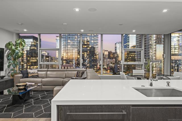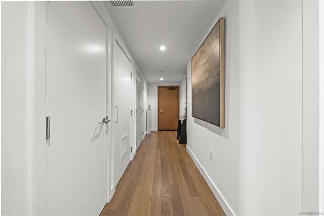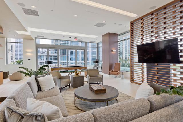 Welcome to Savina residence 1706, where luxury meets location. This 2BR/2BA + nook southeast corner floorplan has rarely been available since the building’s completion. Perched on the 17th floor, this home boasts breathtaking views of the bay, San Diego city skyline, the cruise ship terminal, and even overlooks the Savina pool. Inside, the space is bathed in natural light thanks to a full wall of windows in the open living area. The thoughtfully designed layout includes a primary suite with an en suite bath, a secondary bedroom and separate guest bath, a versatile nook perfect for a home office or cozy reading spot, and a private balcony to soak in those signature San Diego sunsets. This residence is loaded with upgrades: engineered hardwood flooring throughout, additional recessed lighting installed throughout, automated shades, a built-in wine fridge, and an integrated AV/sound system. It also comes with two parking spaces and a storage unit. Perfectly positioned between the Waterfront and lively Little Italy, Savina provides the best of urban living. Residents enjoy over 24,000 square feet of hotel-inspired amenities, including a resort-style pool and spa, BBQ deck, a state-of-the-art gym + yoga terrace, social lounge, business center, 24-hour building staff, community EV charging stations, a pet retreat + dog wash, and Google Fiber Webpass internet included in the HOA dues.