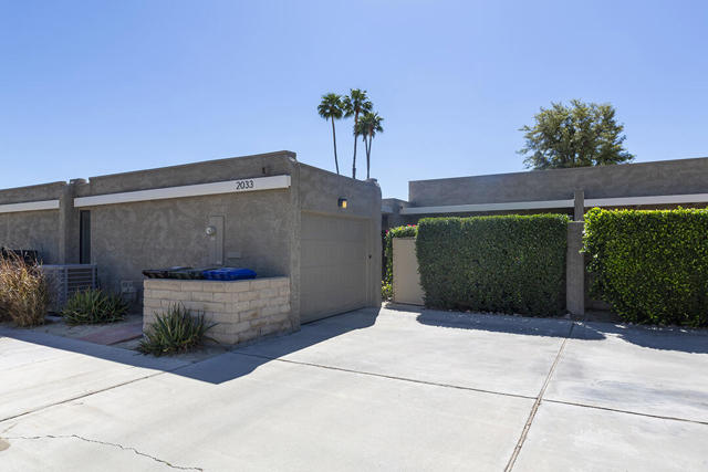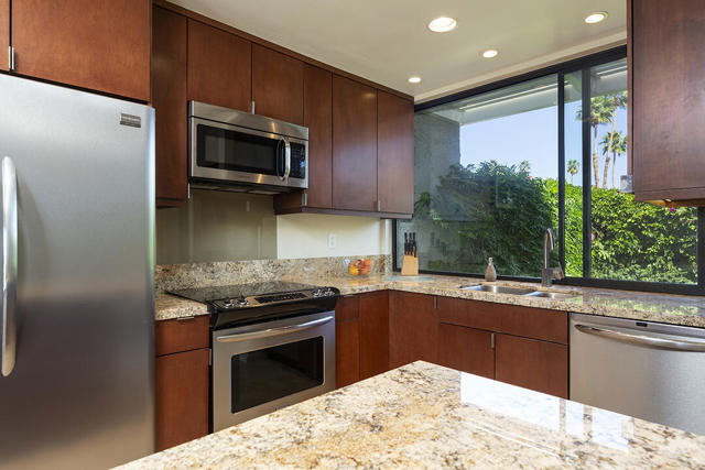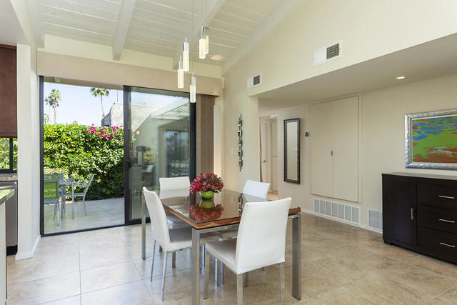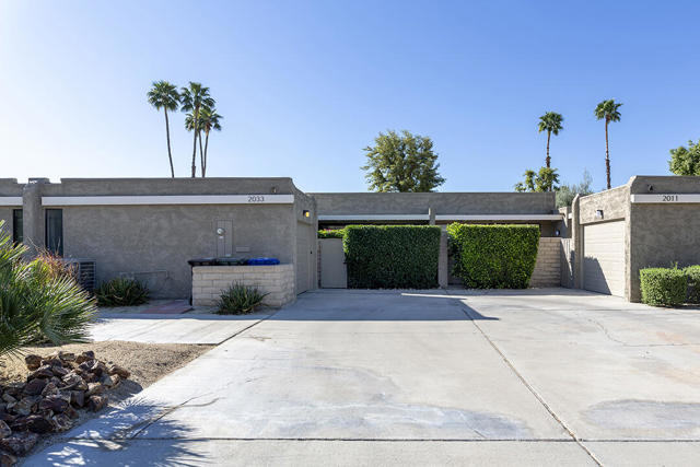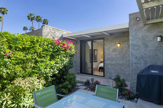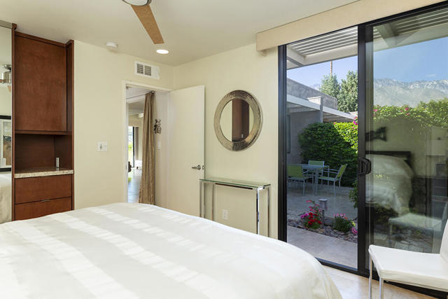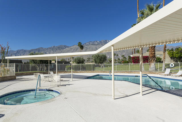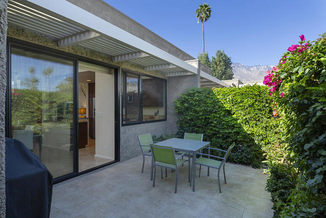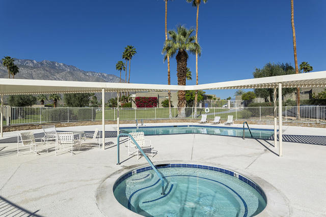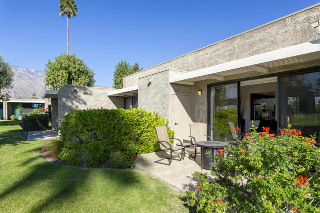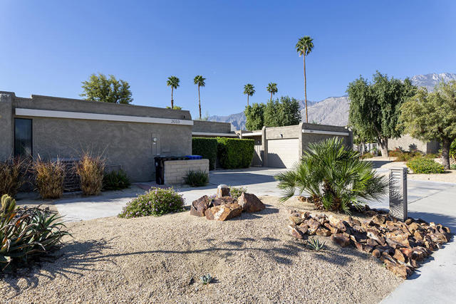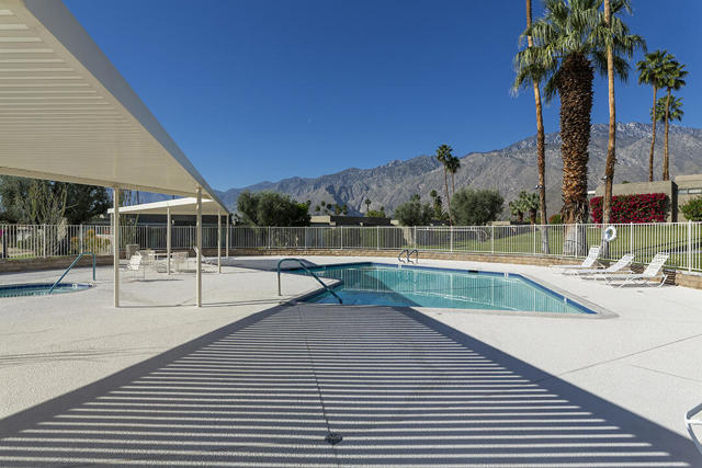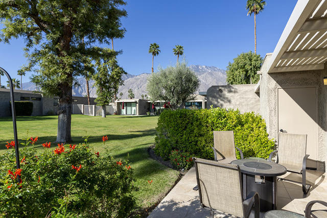 Located in the desirable Sunrise Oasis community in Palm Springs, this single-level two-bedroom, two-bathroom condo with two outdoor patios offers million-dollar views, bright living spaces, and an excellent central Palm Springs location. The updated interior features beamed tongue and groove ceilings in the living room, tile flooring throughout, and a beautifully designed kitchen that anchors the open-concept main living area. Sliding doors open from the living room to the rear patio, allowing for an effortless indoor and outdoor flow and capturing the panoramic views.The floor plan provides excellent separation of bedrooms for privacy and comfort. The spacious primary suite is to the rear of the home and, like the open living area, enjoys access to the rear patio and mountain views. This bedroom includes an updated bathroom with a double vanity and glass-wall shower as well as a large walk-in closet. The guest bedroom also opens to nature with sliding doors to the lush private front patio which also provides a western view. This cozy room has easy access to the beautifully appointed hall bath.In addition to the full remodel completed in 2013, several recent upgrades provide added value and peace of mind, including the replacement of the HVAC system (2024), an updated electrical panel (2025), the replacement of the foam roof (2024), soundproofing the living room wall (2023), and updating the exterior ramadas for additional shade (2022). The home also includes a one-car garage with a washer and dryer and is close to one of the community's three pools.Sunrise Oasis is a low-density Palm Springs community on fee land (land you own, no land lease) featuring three pools, tennis and pickleball courts, all located just minutes from downtown Palm Springs restaurants, shops, entertainment, and nightlife.Additional Items and Amenities Foam roof and the boards beneath replaced | 2024 Replaced heat pump, HVAC system and thermostat | 2024 Electrical panel replaced | 2025 Garage door and door opener replaced | 2024 Replaced exterior closet doors in side and rear patio | 2023 Window tinting applied to all south facing windows | 2023 Living room wall sound proofed | 2023 Ramadas (trellis) above all external sliders replaced | 2022 HOA repainted exterior of building | 2022The HOA dues includes maintenance of common areas and landscaping, three pools, tennis courts, pickleball courts, trash, water.