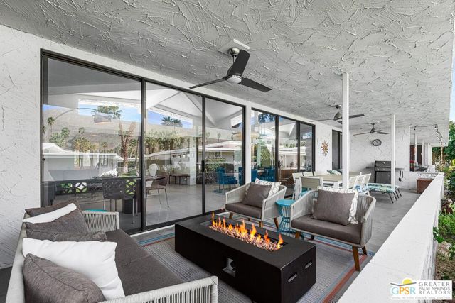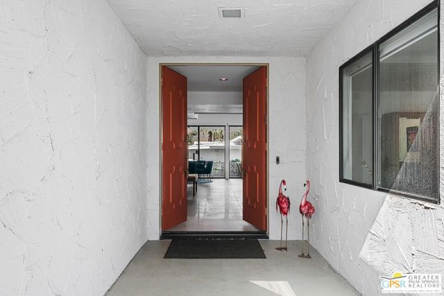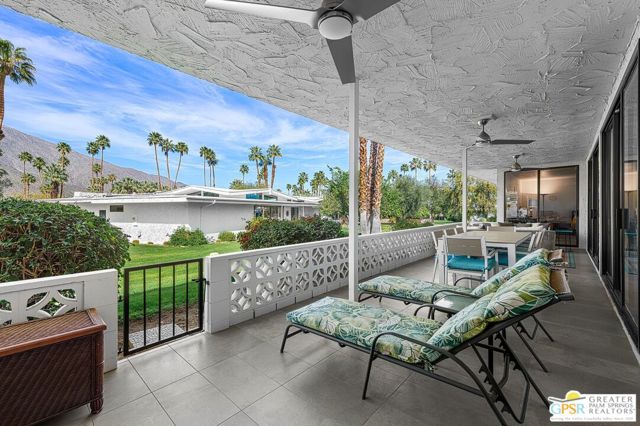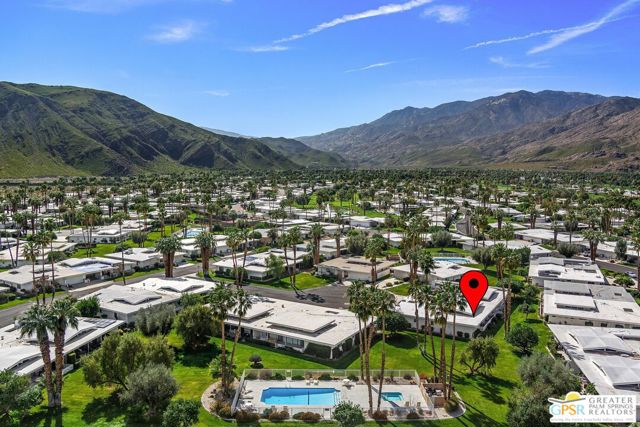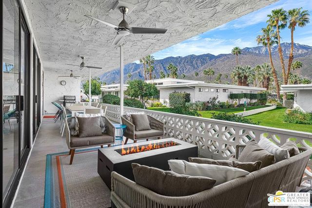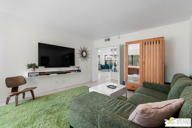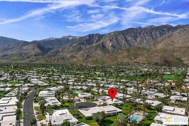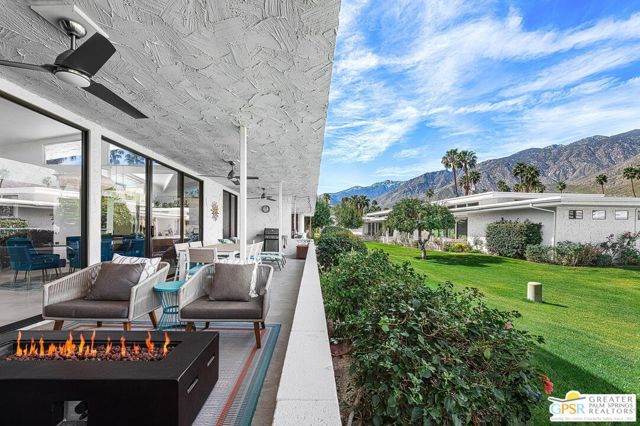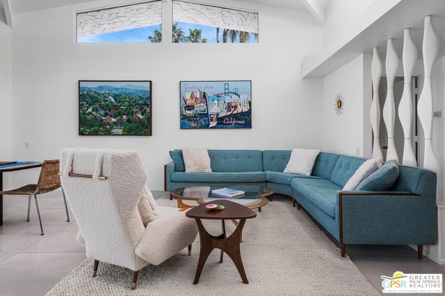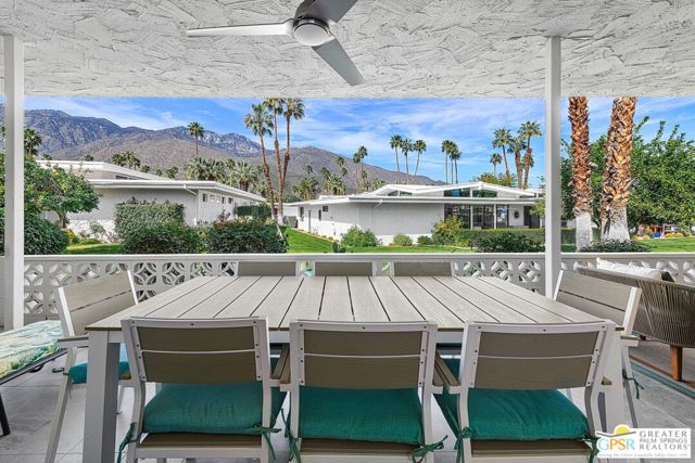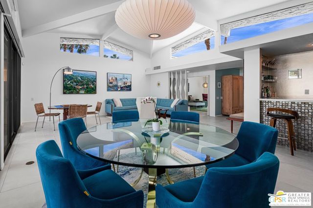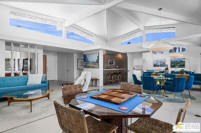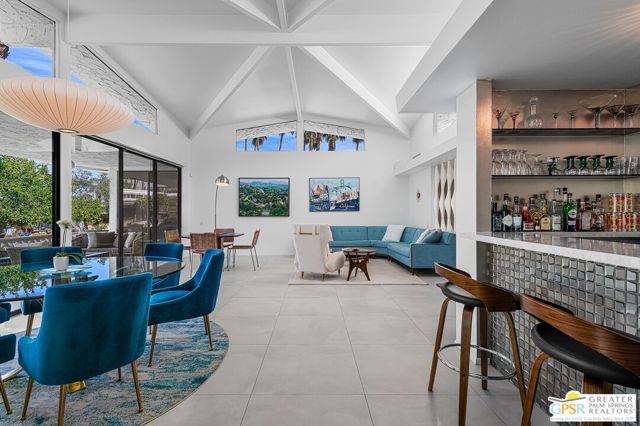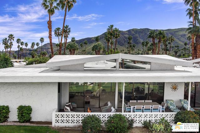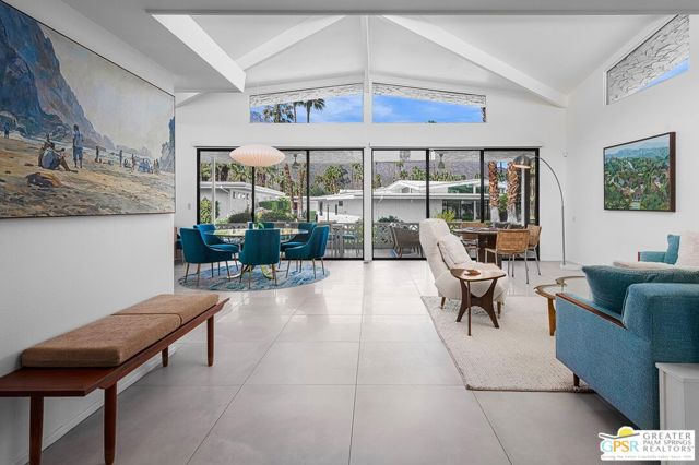 Located in the highly regarded Canyon Estates community in South Palm Springs, this classic mid-century modern residence captures the spirit of desert modernism while offering thoughtful updates for contemporary living. Canyon Estates are celebrated for their architecture, expansive greenbelts, and resort-style amenities and remain one of Palm Springs' most architecturally significant residential communities. Residents enjoy beautifully maintained grounds, multiple pools and spas, tennis and pickleball courts, and a striking clubhouse set against the dramatic backdrop of the San Jacinto Mountains. The home itself makes an immediate architectural statement with its low-slung roofline, classic stone masonry, and bold double-door entry. Inside, the living spaces feel remarkably open and bright, enhanced by soaring vaulted ceilings and a dramatic series of clerestory windows that invite abundant natural light while framing glimpses of the surrounding mountains. Large glass sliders stretch across the rear of the home, seamlessly connecting the interior living areas to the outdoor terrace and the expansive greenbelt beyond. The floor plan reflects the relaxed, social lifestyle of the era, centered around a dedicated wet bar and an easy flow between living, dining, and outdoor spaces. Crisp architectural lines, light finishes, and tile flooring create a clean backdrop that highlights the home's authentic mid-century character. The generously scaled primary suite provides a comfortable private retreat, while the overall layout works equally well for everyday living or entertaining guests. Modern upgrades include owned solar and newer high-efficiency air conditioning systems, offering improved energy performance while preserving the home's architectural integrity. Set within one of Palm Springs' most iconic mid-century communities, this residence offers a rare opportunity to enjoy timeless design, exceptional natural light, and the unique lifestyle that Canyon Estates continues to provide.