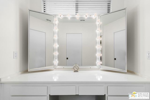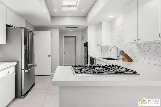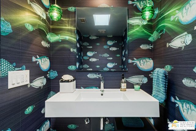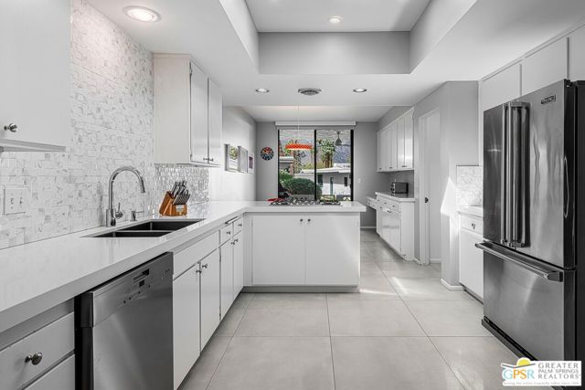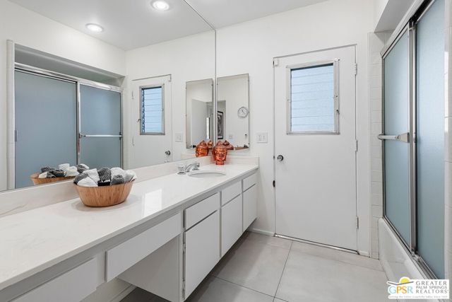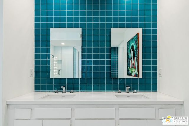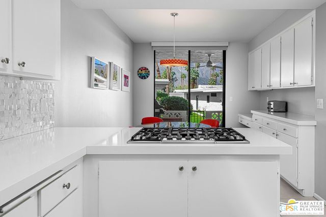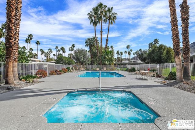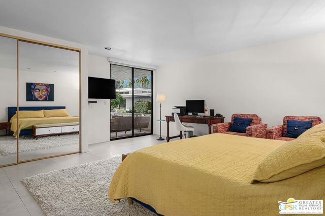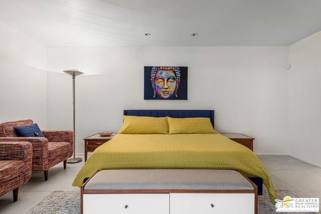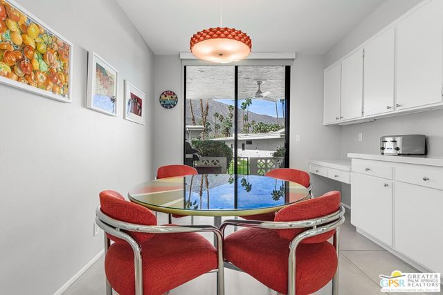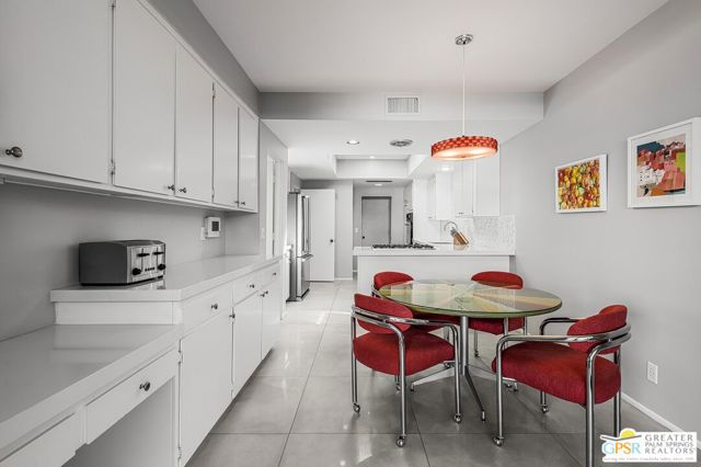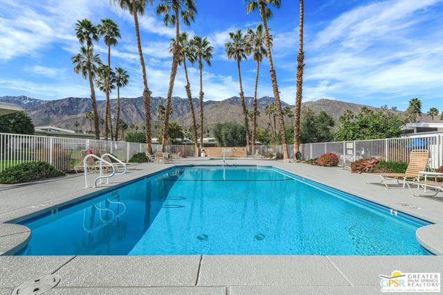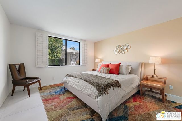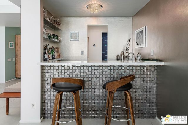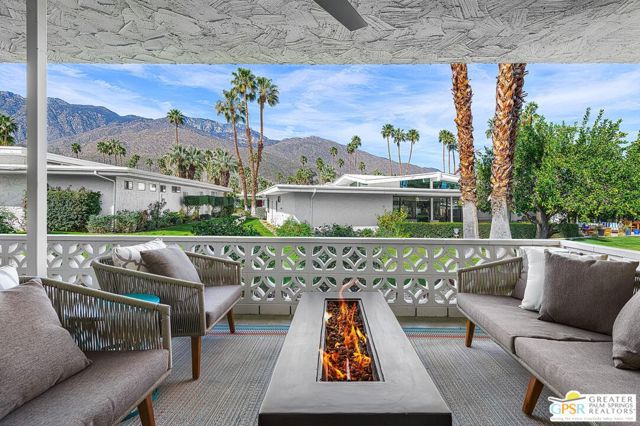 Located in the highly regarded Canyon Estates community in South Palm Springs, this classic mid-century modern residence captures the spirit of desert modernism while offering thoughtful updates for contemporary living. Canyon Estates are celebrated for their architecture, expansive greenbelts, and resort-style amenities and remain one of Palm Springs' most architecturally significant residential communities. Residents enjoy beautifully maintained grounds, multiple pools and spas, tennis and pickleball courts, and a striking clubhouse set against the dramatic backdrop of the San Jacinto Mountains. The home itself makes an immediate architectural statement with its low-slung roofline, classic stone masonry, and bold double-door entry. Inside, the living spaces feel remarkably open and bright, enhanced by soaring vaulted ceilings and a dramatic series of clerestory windows that invite abundant natural light while framing glimpses of the surrounding mountains. Large glass sliders stretch across the rear of the home, seamlessly connecting the interior living areas to the outdoor terrace and the expansive greenbelt beyond. The floor plan reflects the relaxed, social lifestyle of the era, centered around a dedicated wet bar and an easy flow between living, dining, and outdoor spaces. Crisp architectural lines, light finishes, and tile flooring create a clean backdrop that highlights the home's authentic mid-century character. The generously scaled primary suite provides a comfortable private retreat, while the overall layout works equally well for everyday living or entertaining guests. Modern upgrades include owned solar and newer high-efficiency air conditioning systems, offering improved energy performance while preserving the home's architectural integrity. Set within one of Palm Springs' most iconic mid-century communities, this residence offers a rare opportunity to enjoy timeless design, exceptional natural light, and the unique lifestyle that Canyon Estates continues to provide.