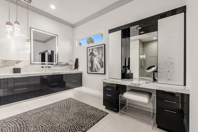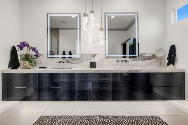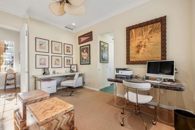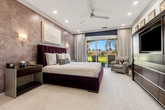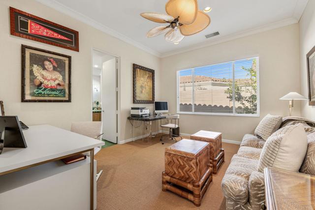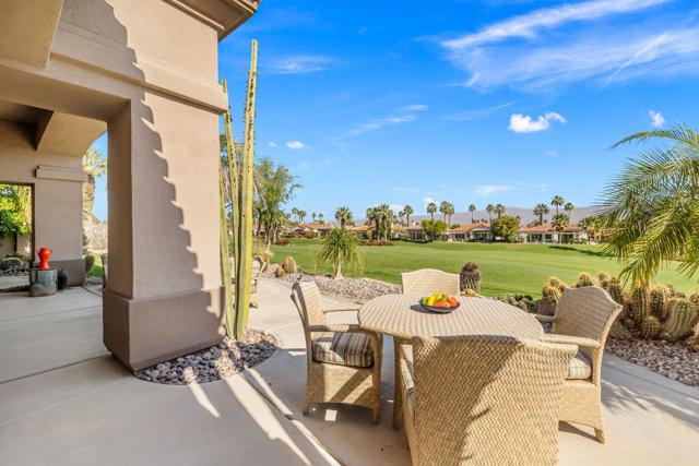 Enjoy sweeping fairway and mountain views from this beautifully maintained and highly sought after Ocotillo 1 floor plan at Indian Ridge Country Club. Designed for effortless desert living, the 3,082 square foot open-concept layout allows the living room, dining area, and kitchen to flow seamlessly to the outdoor patio - perfect for taking in the expansive golf course scenery. The home features hardwood flooring throughout, plantation shutters, custom wall finishes, and a newer HVAC system. The inviting living room is highlighted by a custom fireplace and built-in entertainment center, creating a comfortable space for relaxing or entertaining. The kitchen has been completely reimagined, offering an updated and stylish centerpiece for the home. Featuring upgraded cabinetry, quality appliances, and generous counter space, the space blends modern functionality with elegant design. The open layout and convenient breakfast bar allow the kitchen to connect effortlessly with the living and dining areas, making it ideal for both everyday living and entertaining guests. The primary suite opens directly to the patio and features a completely renovated bathroom, updated with a new walk-in shower, modern cabinetry, updated countertops, and dual sinks for a fresh and contemporary feel. Two guest bedrooms on opposite sides of the house feature en suite bathrooms, with one currently configured as a home office, providing flexibility for guests or remote work. The home also includes an attached two-car garage plus a separate golf cart garage. Situated on an approximately 8,700 square foot pie-shaped lot, the property offers potential space to add a south-facing pool, spa, or casita, creating an opportunity to further enhance the outdoor living experience. Offered partially furnished per inventory. Solar lease with panels installed in 2024 - can be paid off during escrow. Sellers have a Provisional Golf Membership with a buyer going to the Number 1 or 2 spot on a short waitlist. Indian Ridge Country Club offers an exceptional lifestyle with two Arnold Palmer Signature golf courses, tennis and pickleball facilities, fitness center, full-service spa, and a vibrant social and dining scene.