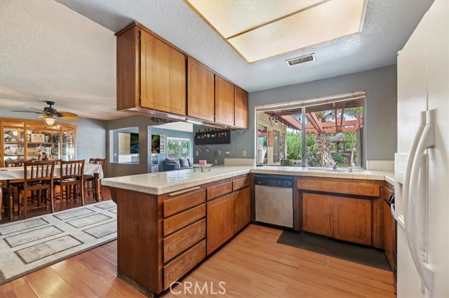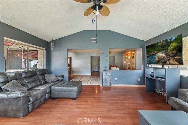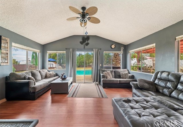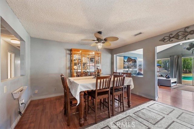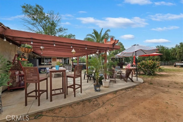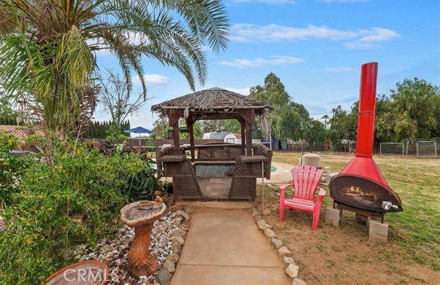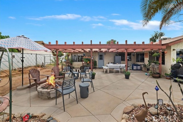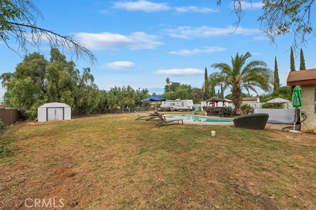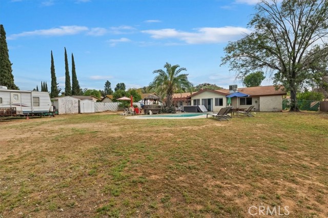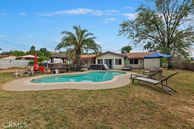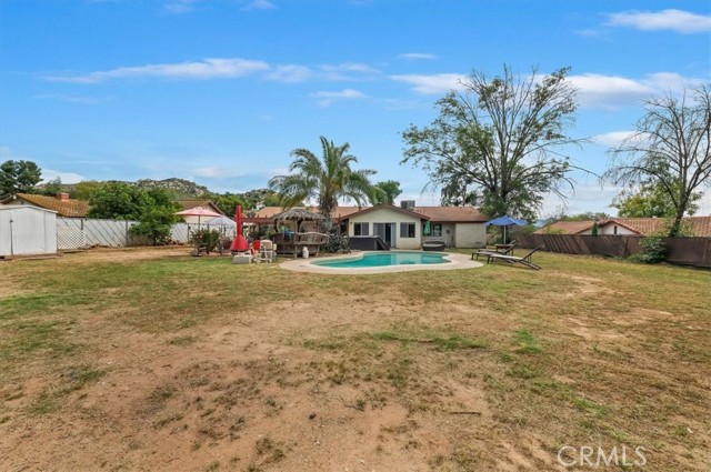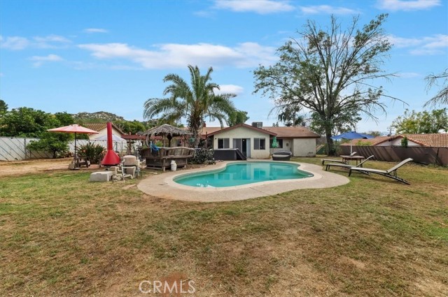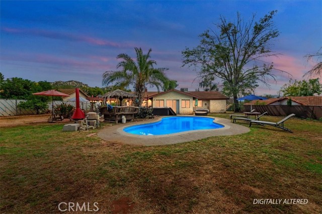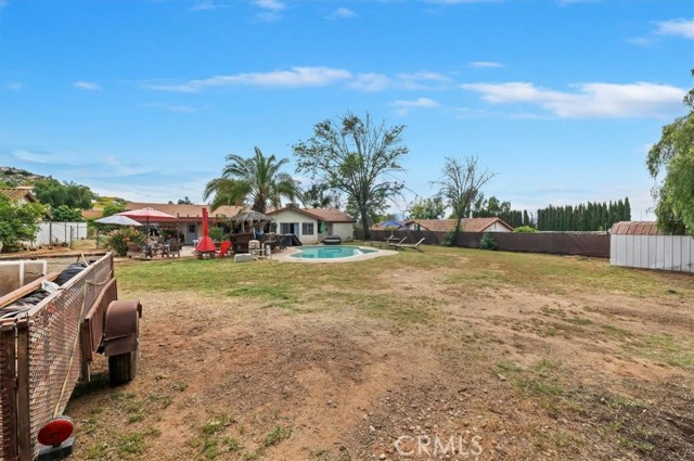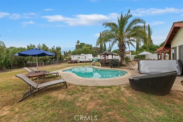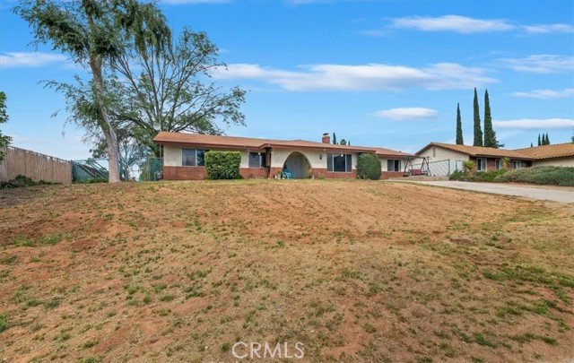 Very nice single story pool home, nestled in the desirable Woodcrest area of Riverside. This spacious home sits on nearly half an acre and offers 2,335 square feet of gracious living space. And, you can have horses! Built in 1973, the property features five bedrooms—including two primary suites—and three bathrooms, providing flexible living options ideal for multi-generational households or guests. A large front yard creates an impressive setback from the street, enhancing privacy and offering plenty of space for future landscaping possibilities. A distinctive arched entryway provides a unique architectural focal point and welcoming transition into the home. The formal living room showcases a stacked-stone fireplace with a classic arched opening, creating a warm space for gatherings. A large picture window fills the room with natural light while offering views of the surrounding neighborhood and hills. The main living area features a contemporary open-concept layout with laminate wood flooring throughout the primary spaces. The family room is bright and inviting with vaulted ceilings, large windows that bring in abundant natural light, and an open connection to the dining and kitchen areas. A sliding glass door leads directly to the backyard, creating seamless indoor-outdoor flow. Perfect for year-round entertaining, the backyard offers multiple outdoor living areas. A spacious patio provides plenty of room for gatherings, complemented by an above-ground jacuzzi and a uniquely shaped pool with paved edging. A beautifully scored concrete patio anchors the space, while a freestanding pergola creates a shaded “outdoor room” ideal for dining or relaxing. A stone fire pit provides the perfect setting for evening gatherings. There are decorative rock borders and low-maintenance landscaping. Beyond the pool area is a large additional yard space ideal for a play area, horses, pets, RV parking or extra vehicles. Mature trees line the perimeter, offering privacy and shade while enhancing the property's peaceful setting. This wonderful Woodcrest property offers generous space, unique character and lots of possibilities in a highly desirable location.