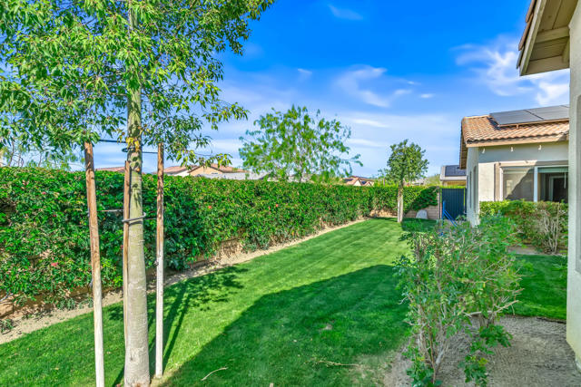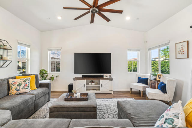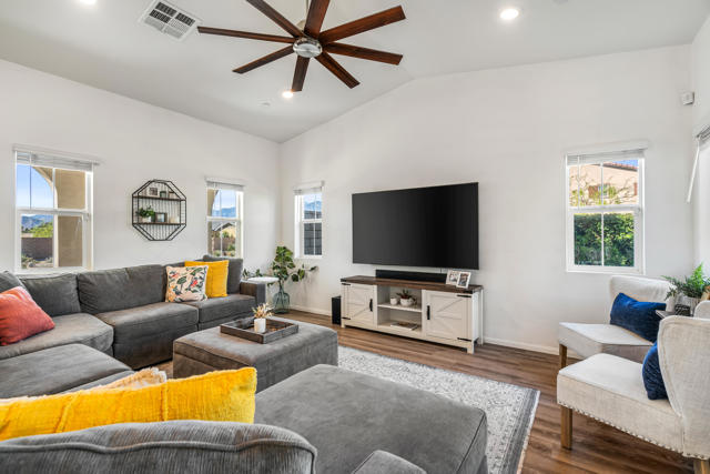 Located within the Verano community, this newer residence offers modern construction, mountain views, and a desirable corner-lot setting within one of the area's most thoughtfully planned neighborhoods. Built in 2019, the home incorporates contemporary finishes designed for both comfort and efficiency. Wood-look vinyl flooring runs throughout the primary living areas, complementing an open floor plan that connects the great room, dining area, and kitchen. The kitchen is designed with everyday function in mind, featuring white cabinetry, granite countertops with an island, stainless steel appliances, and generous prep space.The primary suite is spacious with natural light and an en-suite bathroom, while the guest bedrooms are ideally sized. A welcoming covered porch entry, large laundry room with additional storage, and attached garage add to the home's practical layout.Positioned on a corner location, the property enjoys open sightlines and surrounding mountain views. The property also has a solar system that has covered the usage very well for the current owners.Residents of Verano enjoy access to a central clubhouse with resort-style pool and spa, a fitness center, sport courts, playground areas, and more. Wide streets, landscaped paseos, and the surrounding San Jacinto and Santa Rosa mountain views contribute to the neighborhood's appeal for both full-time and seasonal residents.