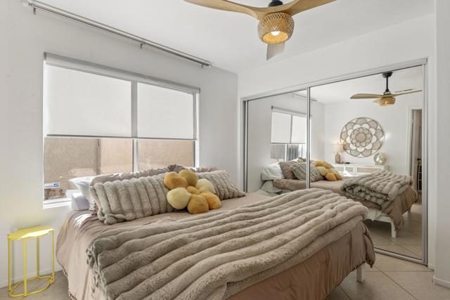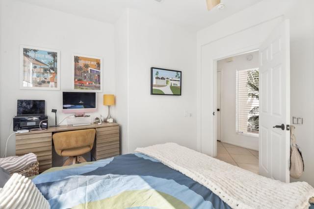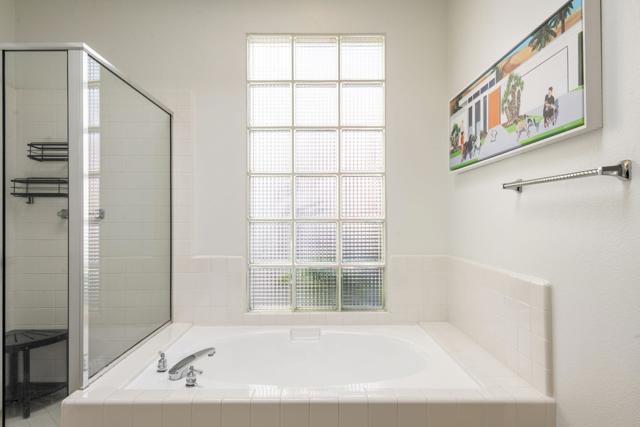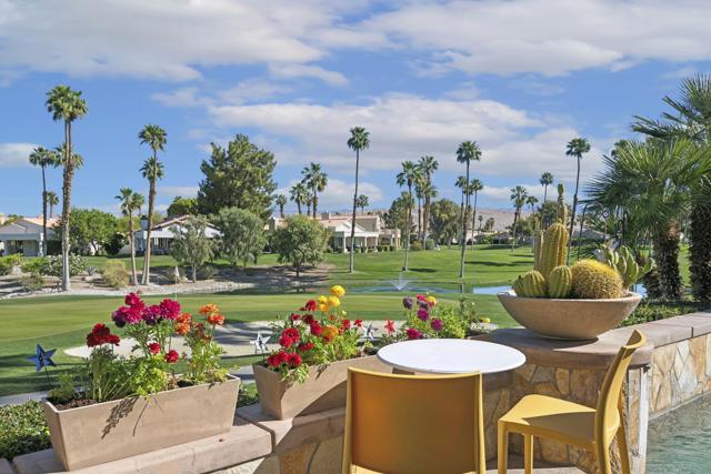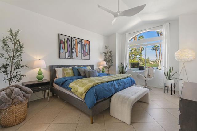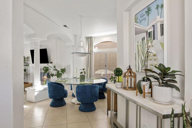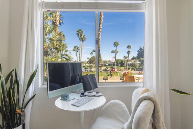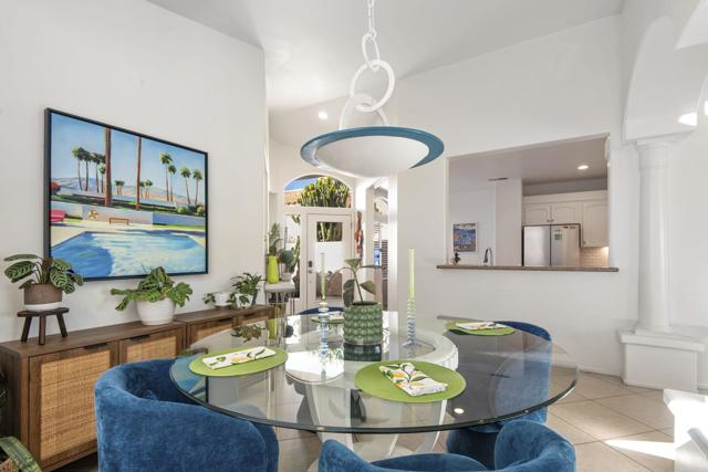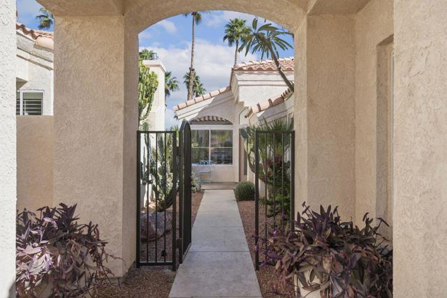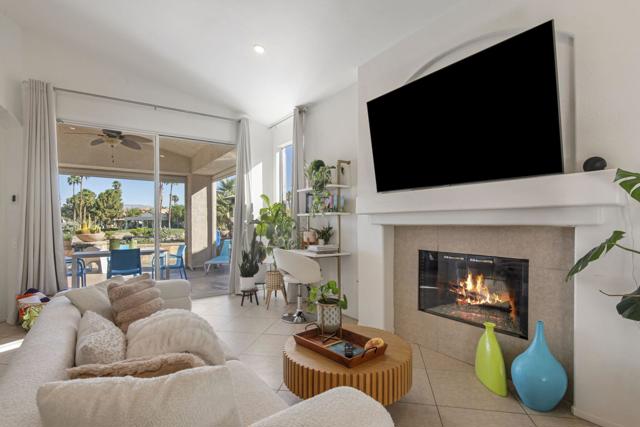 3-bedroom, 2-bath home located on the golf course with a private spool! Situated in a gated community with great amenities, this home features a gated courtyard with a charming outdoor dining area for two, along with an enclosed gated rear patio. Inside, the open floor plan is filled with natural light and includes a welcoming living area with a fireplace and newer blinds throughout. The modern kitchen offers newer appliances, crisp white cabinetry, and a faux tile backsplash, along with a dining nook, while a separate dining area provides additional space for gatherings. Spacious bedrooms and updated bathrooms offer comfort throughout, including a primary suite with an ensuite bathroom featuring a soaking tub and separate walk-in shower. A glass slider opens to the backyard overlooking the golf course, where you'll find the spool along with both covered and uncovered dining areas--perfect for relaxing or entertaining while enjoying the view. Recent upgrades include newer central AC, a newer pool filter, a newer spa pump, and a newer 25-year solar system for added energy efficiency. Additional conveniences include a pet door providing easy access to the outdoors. This home perfectly combines comfort, thoughtful upgrades, and golf course living in a desirable gated community.