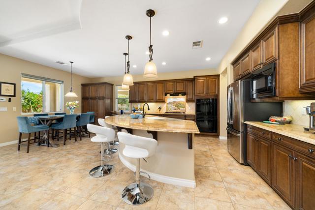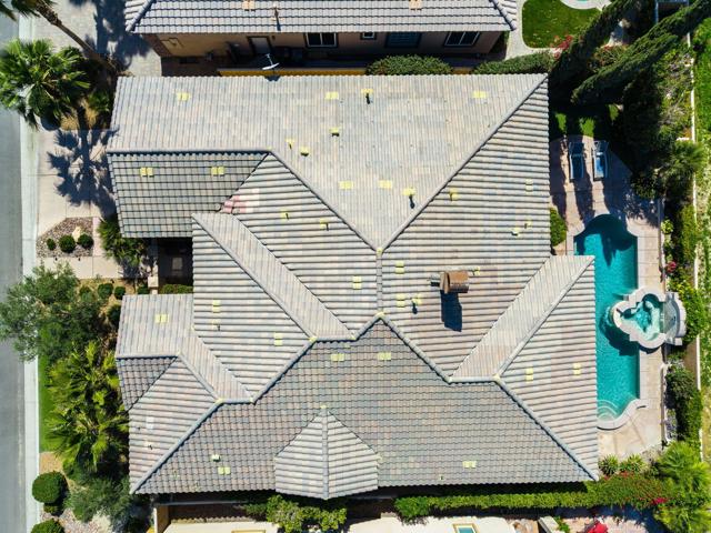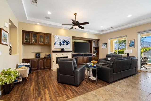 Commanding unobstructed western mountain views and overlooking the lush fairways of The Palms Golf Course, this beautifully designed residence captures the essence of desert luxury living.The private rear yard is a serene retreat, featuring a sparkling pool and spa accented by a graceful fountain feature--an ideal setting for sunset gatherings and tranquil evenings under the desert sky. The salt water pool/spa have been recently drained, cleaned with new tiles at surround and refreshed Heater and pumps. A beautifully detailed entry door welcomes you into a dramatic foyer with soaring 12-foot ceilings and custom tile flooring, immediately establishing the home's refined character. Throughout the residence, luxury details are evident and include generous crown molding, kitchen backsplash with custom tiling The gourmet kitchen is both elegant and functional, offering granite countertops, abundant and upgraded cabinetry with soft-close drawers, an oversized eat-at bar, and a convenient built-in desk area. The kitchen flows seamlessly into the expansive great room, where custom built-ins and a fireplace create a warm and inviting gathering space.A formal dining room provides an elegant setting for entertaining, while the adjacent oversized bonus room offers flexible use as a den or office.Guest accommodations are thoughtfully designed with two en-suite bedrooms connected by a Jack-and-Jill bath, ensuring privacy and comfort for visitors.The primary suite is a luxurious sanctuary with direct access to the patio, a generous walk-in closet, and a versatile recessed space perfect for a fitness area, office,or sitting room. The spa-inspired primary bath features a large walk-in shower, dual vanities, a seated vanity area, and a relaxing jetted soaking tub.Additional features include surround sound throughout most rooms, central vacuum, a well-appointed laundry room with storage, and electric sun shades on the rear patio.The extended garage provides abundant storage and space for a golf cart or recreational vehicle.This tandem space can easily be turned into a 4th bedroom, especially with easy access to hall bath. Designed with effortless indoor-outdoor living in mind, the open kitchen, great room, and outdoor spaces combine to create a home that is equally suited for grand entertaining or quiet desert relaxation.
