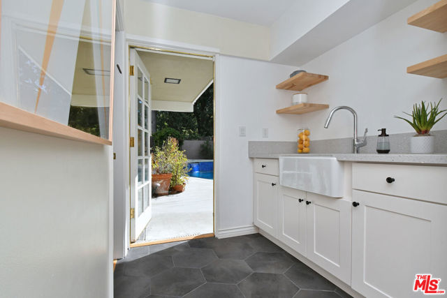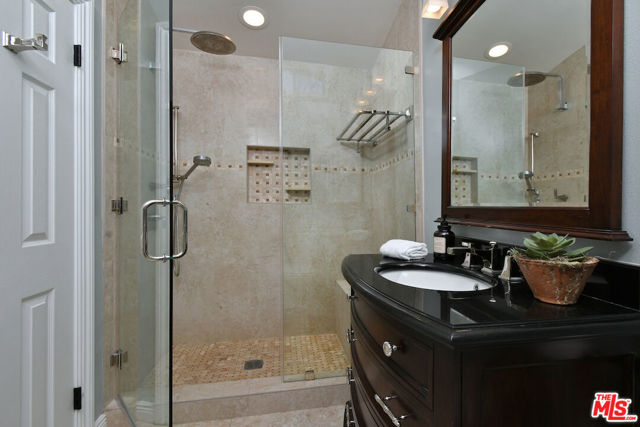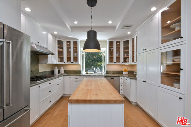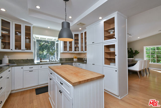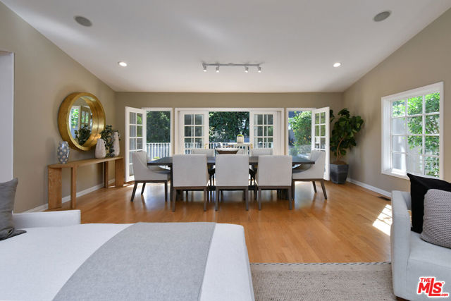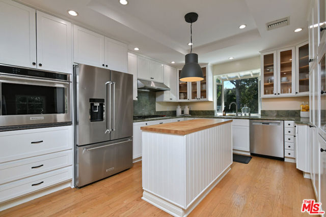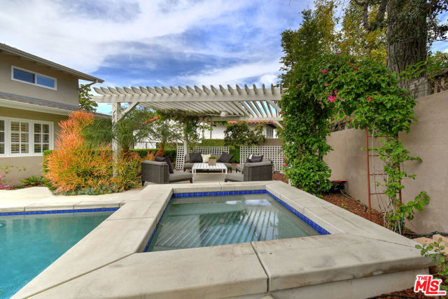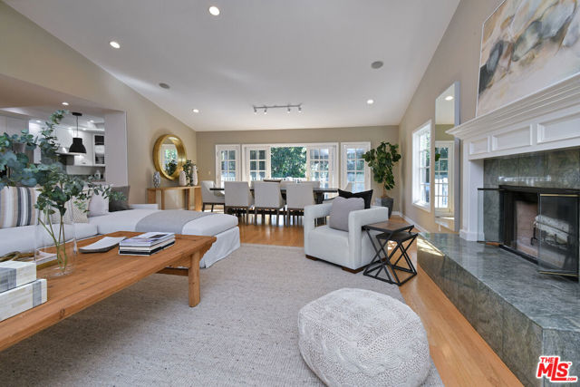Inviting traditional home ideally located south of Ventura Blvd. on a quiet street in the foothills of Sherman Oaks. A double-door entry opens to a spacious living area with high ceilings, hardwood floors, a mantled fireplace, and picture windows. The center island kitchen includes built-in appliances, glass-front cabinets, and a pantry. French doors from the dining room lead to a deck and BBQ area for outdoor dining. There are four bedrooms, including a private bedroom suite with a kitchenette, built-in desk, bookshelves, dressing area, and en-suite bathroom, plus a separate entrance. The primary bedroom includes a custom-designed walk-in closet and a luxurious en-suite bathroom with a glass shower and soaking tub. A large family room offers flexible space for everyday lounging, a home theater, or game room. The backyard features gardens, a large swimmer's saltwater pool, spa, and patios for entertaining and relaxing. Additional highlights include an indoor laundry room, a two-car attached garage with direct entry, solar panels, and an EV charger.