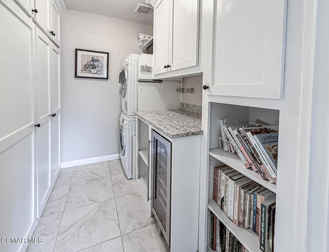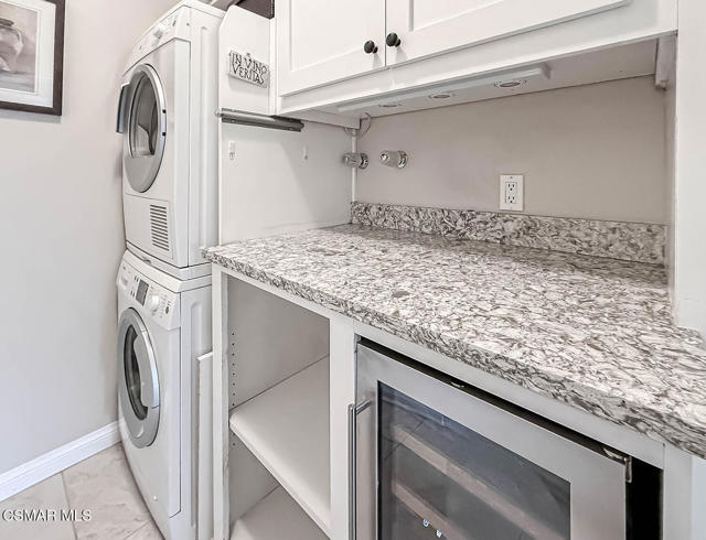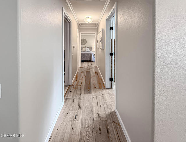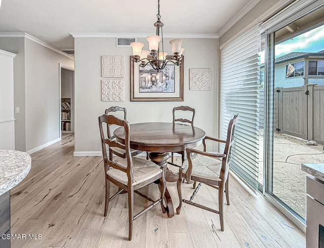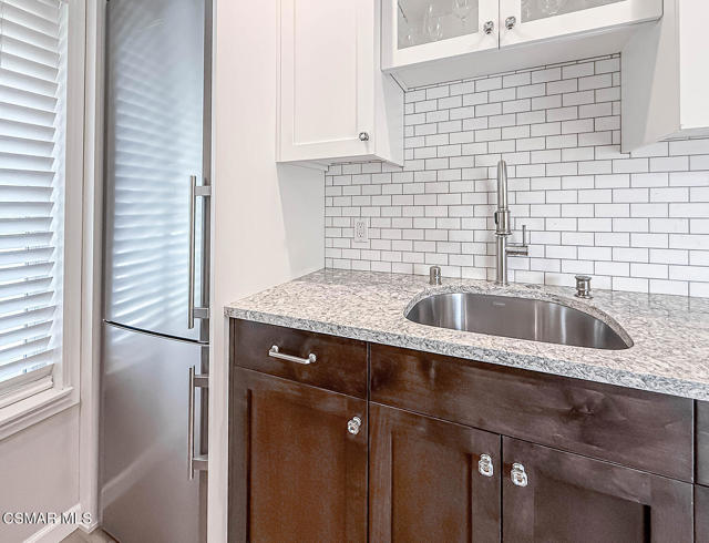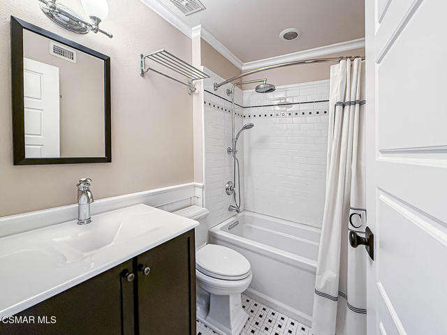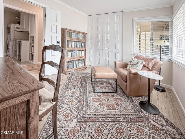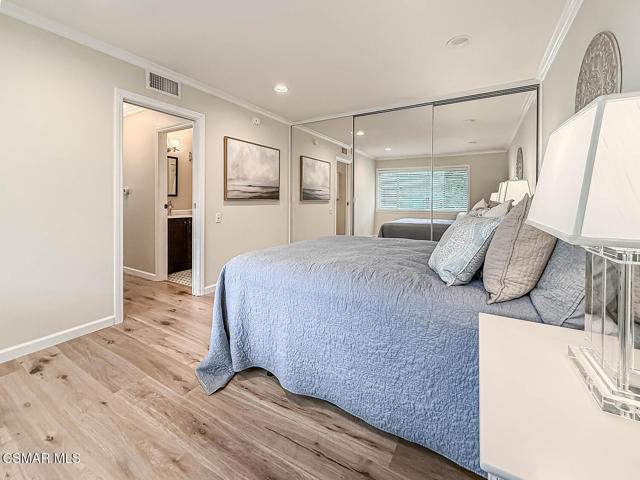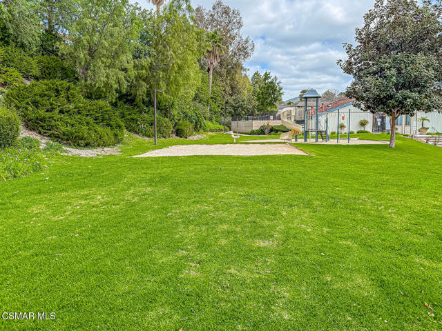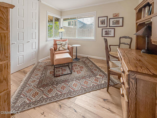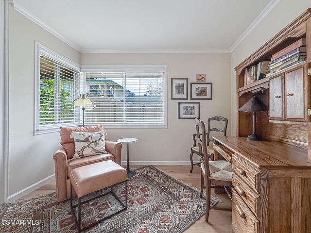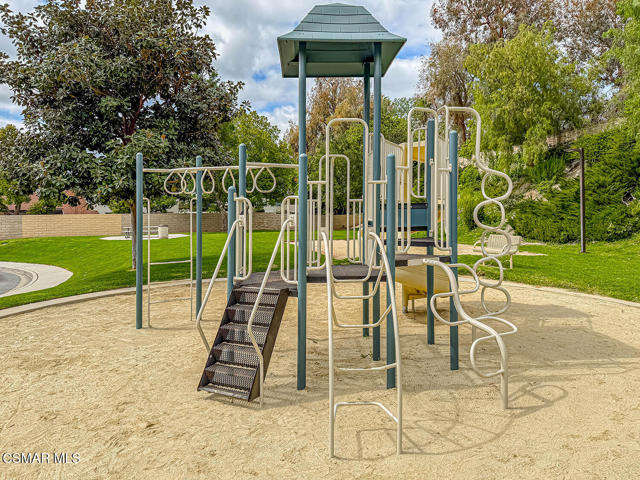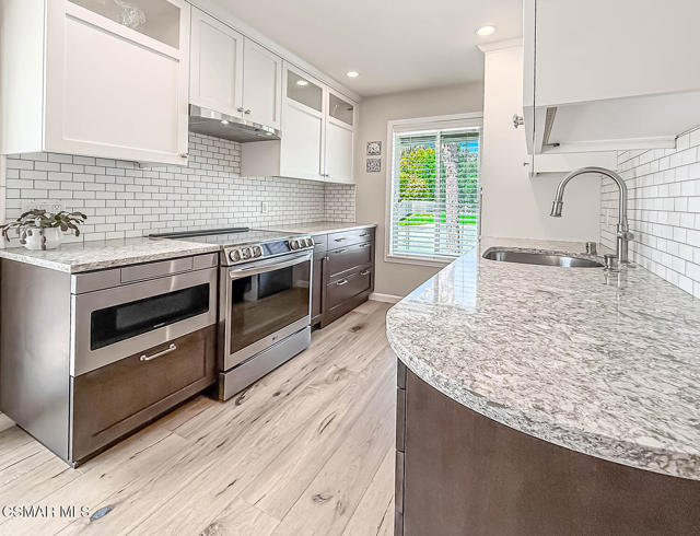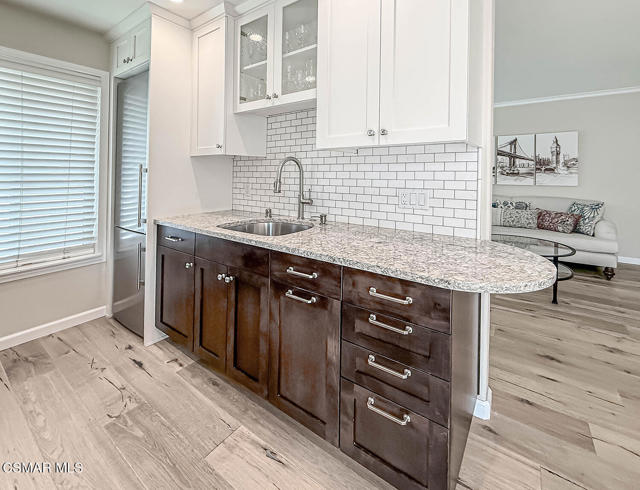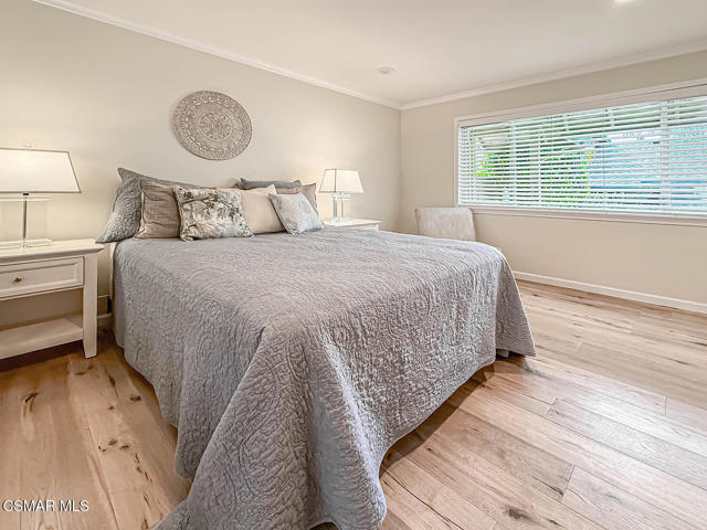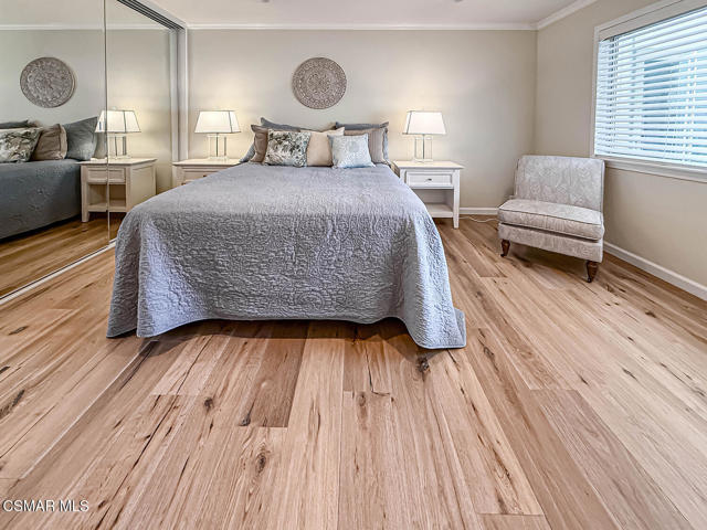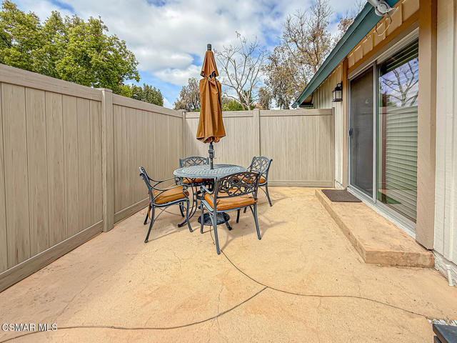 Oakbrook Village END-of-Cul-De-Sac Gem -- COMPLETELY Remodeled with NO Expenses Spared! Tucked away at the end of a QUIET cul-de-sac in desirable Oakbrook Village, this beautifully reimagined 2-bedroom condo showcases an impressive level of craftsmanship and thoughtful upgrades throughout. With NO interior steps, a PRIVATE patio retreat, and immediate proximity to the community playground, pool & spa, and clubhouse, the location delivers exceptional convenience while maintaining a peaceful residential feel.Fantastic curb presence welcomes you with lush green lawns and an upgraded front door paired with a windowed security door featuring a cleverly hidden internal screen. Step inside and you're immediately greeted by the warmth and elegance of American + English wide-plank engineered hardwood flooring found THROUGHOUT the home, complemented by refined CROWN molding that adds an extra touch of sophistication to nearly every room.The Living Room feels SUPER BRIGHT, illuminated by large windows overlooking the front yard and anchored by a handsome built-in media and entertainment center that adds both style and practical storage. Just beyond, the Dining Area is bathed in natural light from Milgard dual-paned sliding glass doors that open directly to the private patio--an inviting setting for outdoor dining, morning coffee, or relaxing evenings.The Kitchen has been GORGEOUSLY remodeled with tasteful finishes and premium materials. Chic QUARTZ countertops, classic subway-tile backsplashes, and HIGH-END Bellmont 1900 Series natural-wood cabinetry with remarkable soft-close mechanisms create a space that feels both polished and functional. Additional highlights include under-cabinet lighting, a cleverly hidden drawer, and a premium stainless-steel sink. High-quality appliances elevate the space even further, including a Liebherr refrigerator/freezer and an LG induction oven.Both bedrooms are generously sized and thoughtfully upgraded. The Secondary Bedroom includes a closet with built-in closet organizers and the Primary Bedroom features a WALL-length closet enhanced with high-end built-in's.The Bathroom has been stylishly updated, showcasing striking white-and-black mosaic porcelain tile flooring, a modern built-in vanity, and a beautifully redone tub/shower with upgraded chrome fixtures including both a rain shower head and handheld wand.A dedicated Laundry Room provides its own separate space and continues the theme of upscale finishes with upgraded ceramic-tile flooring, beautiful cabinetry and pantry doors, QUARTZ countertops, and even a Wine Enthusiast beverage refrigerator.Step outside to the private stamped colored-concrete patio, surrounded by tall vinyl fencing that creates a peaceful outdoor retreat perfect for relaxing or entertaining.Additional highlights include a NEWER water heater (Dec 2023) and a large Trane XR13 A/C condenser providing efficient cooling. The unit also includes two parking spaces--one covered and one adjacent uncovered assigned space.Residents enjoy access to AWARD-WINNING Conejo Valley Schools and exceptional proximity to outdoor recreation, including the beautiful Lang Ranch hiking & biking trails. The home also offers wonderful walkability to the association pool & spa, public playground, and Los Cerritos Middle School, making this location both convenient and highly desirable.