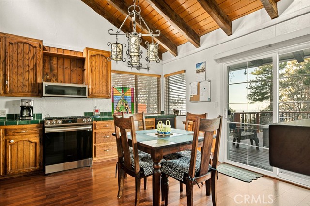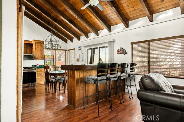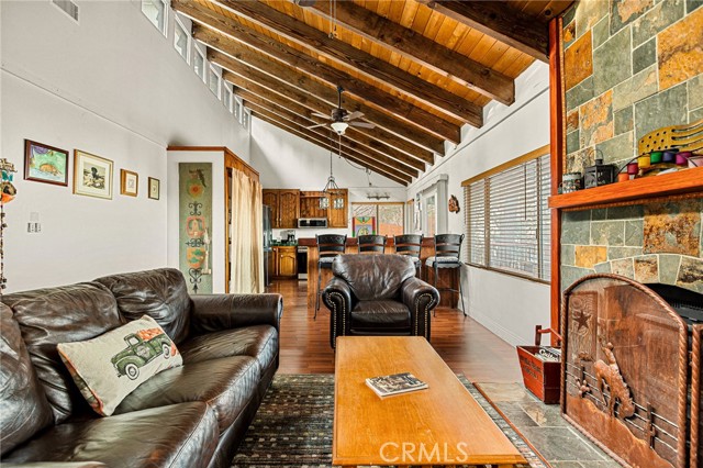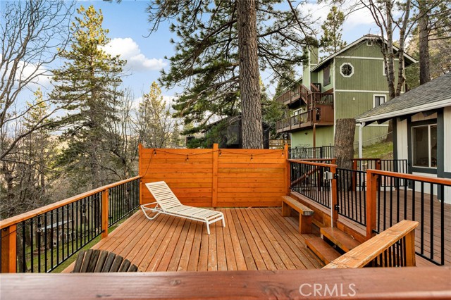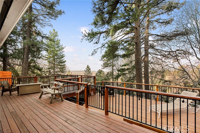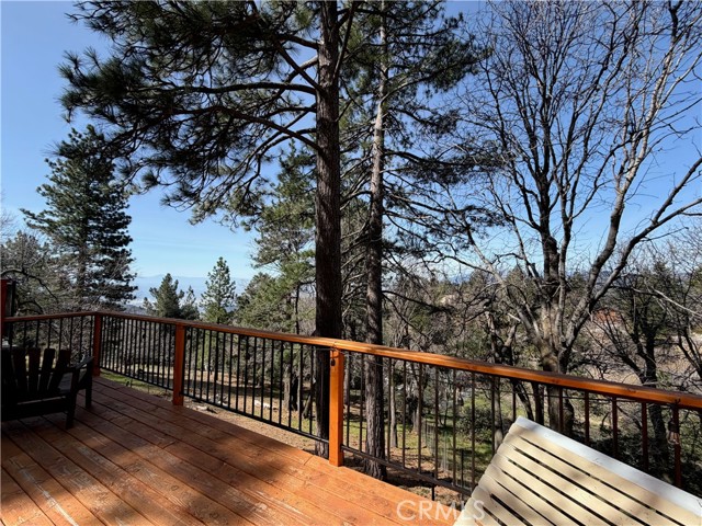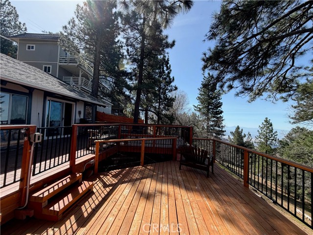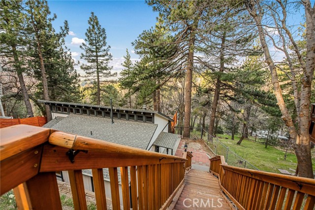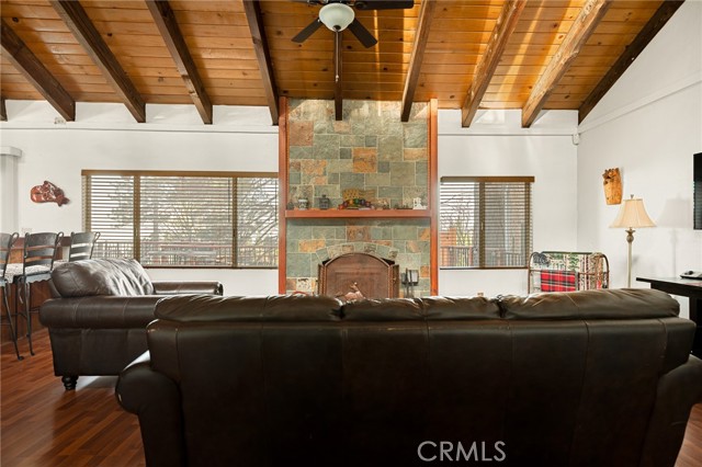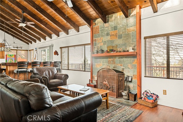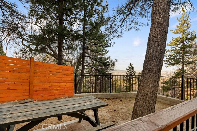 Majestic views take center stage in this charming 2-bedroom, 2-bathroom mountain cabin, offering the perfect blend of comfort, character, and outdoor living. Tucked below street level for added privacy, the home features off-street parking for multiple vehicles and a paver landing leading to the entry of this single-level retreat. Inside, you’ll find knotty pine vaulted ceilings and a stunning stone hearth fireplace that anchors the living space with warmth and rustic elegance. The layout includes a guest bedroom and full bathroom off the living room, while the primary suite offers its own bathroom with a beautifully tiled walk-in shower. The kitchen features an eat-at bar and convenient laundry area, making everyday living easy and functional. Step outside to truly appreciate the setting with a gorgeous newer main deck and an additional tiered deck below—perfect for sunbathing or soaking in the views. The side yard with picnic area is ideal for summer BBQs and outdoor gatherings. Situated on a spacious 13,056 sq ft lot, the property also includes a fenced backyard and numerous upgrades such as a newer water heater, HVAC system, roof, and decking—offering peace of mind for years to come. Located just minutes from the local ski resort and scenic hiking trails, this home is perfect for full-time living or a relaxing weekend getaway in the mountains.