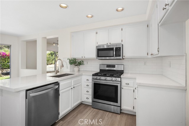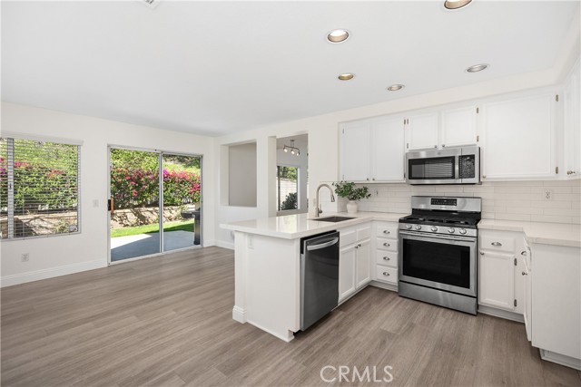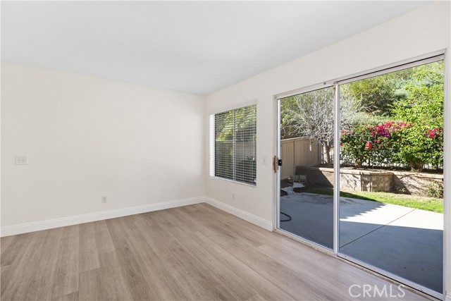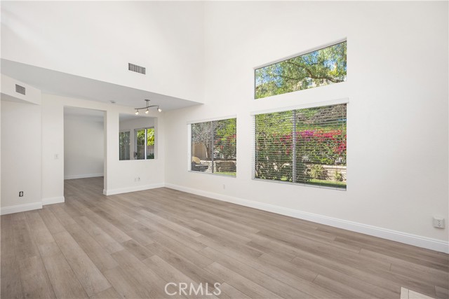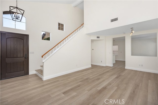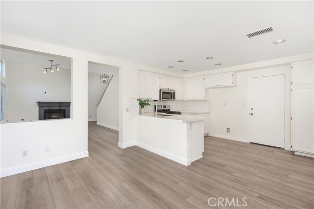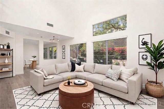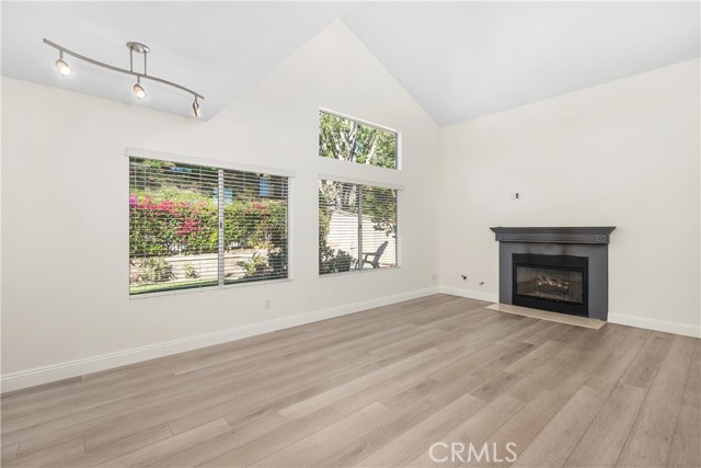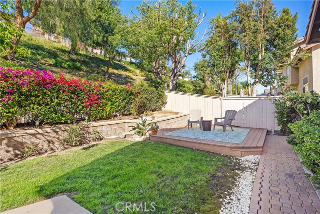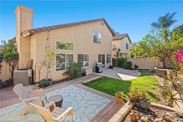 Welcome to this bright and inviting detached single-family residence, ideally situated on a single-loaded street offering enhanced privacy and a peaceful setting. Featuring 3 bedrooms and 2.5 bathrooms, this well-maintained home is filled with natural light throughout. The living room showcases vaulted ceilings and a cozy fireplace, creating an open and welcoming atmosphere. A dedicated dining area flows seamlessly into the kitchen, which is equipped with Corian countertops, updated appliances, and ample cabinetry—ideal for everyday living and entertaining. All bedrooms are located upstairs, including the spacious primary suite with a walk-in closet featuring custom built-ins and an en-suite bathroom with dual sinks and a soaking tub. Two additional bedrooms and a full bathroom complete the upper level. The private backyard offers a tranquil outdoor space with a grassy area and mature fruit trees—perfect for relaxing, gardening, or outdoor enjoyment. The attached two-car garage includes an epoxy-coated floor for added durability and a clean, finished look. Conveniently located near toll roads, shopping, dining, and entertainment, this home combines comfort, privacy, and accessibility.