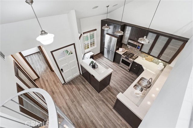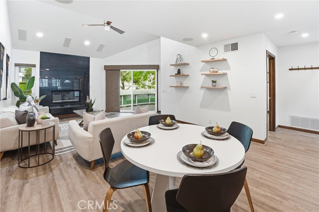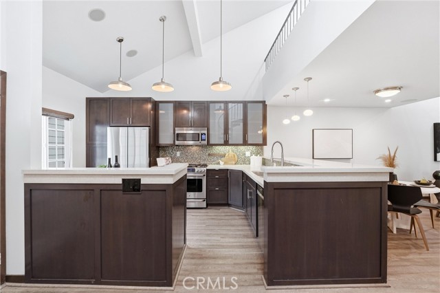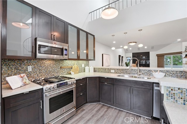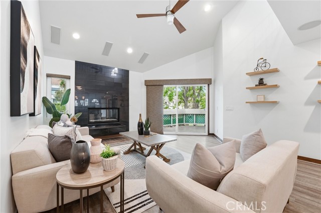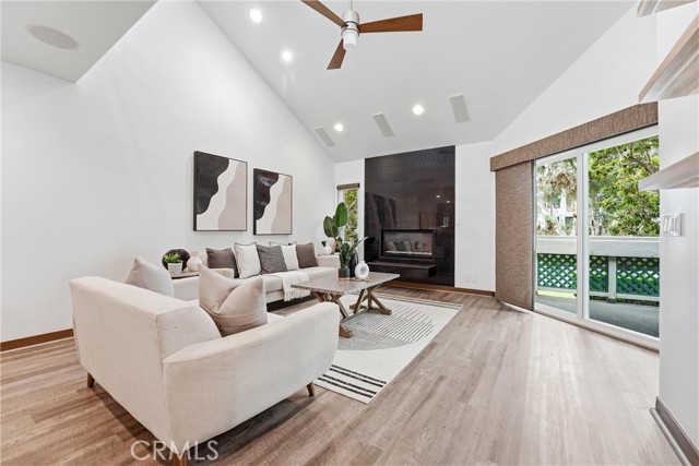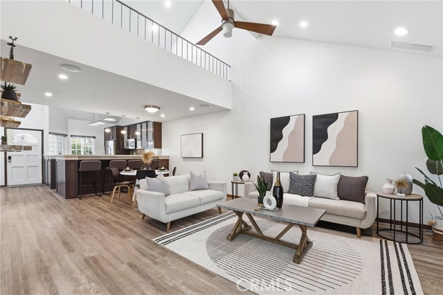 Welcome to the prestigious 24-hour guard-gated community of Pacific Ranch—where resort-style living meets the effortless coastal lifestyle of Huntington Beach, just moments from the sand. Rarely available and highly sought after, this exceptional 2-bedroom residence with an upstairs loft offers over 1,400 square feet of thoughtfully designed living space, enhanced by soaring ceilings and an abundance of natural light that create a truly open feel. The home has been beautifully curated with luxury vinyl flooring, dual-pane windows, recessed lighting, and smart home features including a Nest thermostat. The open-concept layout seamlessly connects the main living areas. The kitchen is both refined and inviting, featuring maple cabinetry, stone countertops, stainless steel appliances, a designer backsplash, breakfast bar, and beverage refrigerator—perfect for entertaining. The spacious family room showcases a custom stone fireplace, surround sound system with a dedicated entertainment closet, and sliding doors that open to a private balcony overlooking lush greenbelts. The primary suite offers vaulted ceilings, custom-organized closets, and direct balcony access for seamless indoor-outdoor living. The spa-inspired bath features stone countertops and a walk-in steam shower. The secondary bedroom is generously sized and paired with a beautifully upgraded full bath. A striking spiral staircase leads to the versatile loft, ideal as a third bedroom, office, or media room. Additional highlights include an enclosed one-car garage, assigned parking space, inside laundry, skylights, and thoughtful upgrades throughout. Residents of Pacific Ranch enjoy pools, spas, a clubhouse, streams, and beautifully maintained grounds. Ideally located near Seacliff Shopping Center, Huntington Beach High School, and just a short bike ride to the iconic Huntington Beach Pier, Pacific City, and Main Street—this is coastal living at its finest.