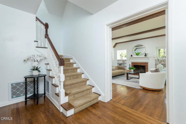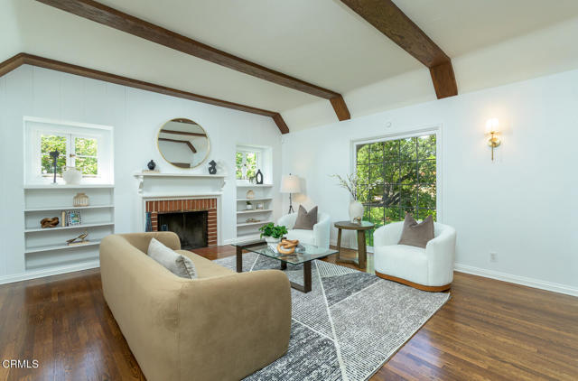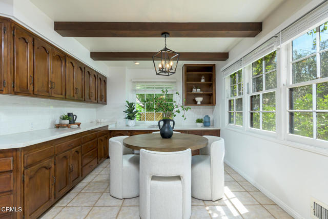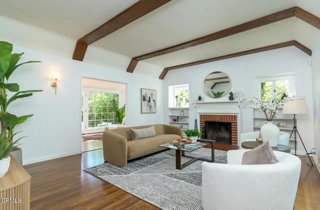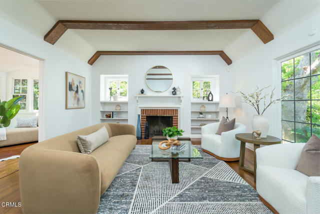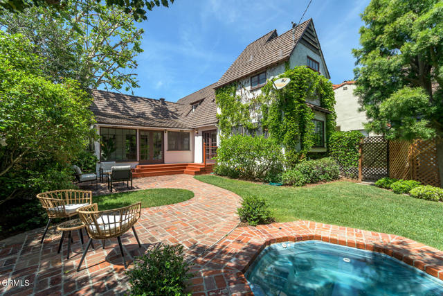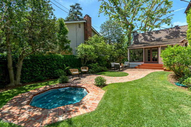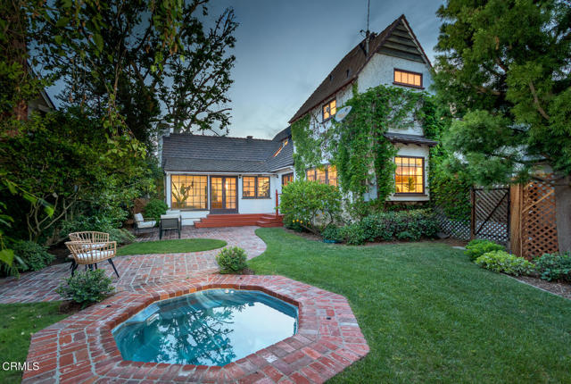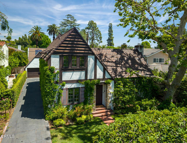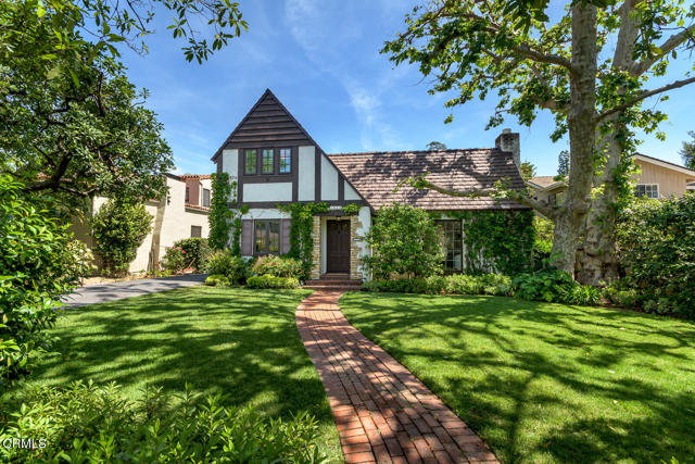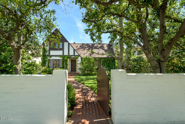 Charming English Tudor-style home in San Marino's Mission District with a sunlit layout and seamless indoor-outdoor flow. Set behind a gated brick wall, the property features a front lawn and a gently curving brick pathway leading to the entry, where mature landscaping creates a warm and inviting approach. Inside, a formal foyer opens to a spacious living room anchored by a fireplace, with a large picture window overlooking the front lawn and smaller windows flanking the fireplace that bring in natural light and architectural balance. The living room flows into a sunroom/family room wrapped in windows overlooking the backyard, where French doors and surrounding windows span much of the wall, bringing in natural light and views of the greenery outside while opening directly to the yard for a seamless indoor-outdoor connection. The formal dining room connects to both the sunroom and kitchen, offering an open yet defined space well suited for both everyday living and entertaining. The kitchen features a center island, abundant cabinetry, and a spacious breakfast nook with a built-in desk, shelving, and drawers, providing both functionality and flexible workspace. French doors from the kitchen lead to steps down to the backyard, reinforcing the home's natural connection between interior spaces and the outdoor setting. A main-level bedroom is located off the foyer, along with a three-quarter bath that also connects to the laundry room. The laundry room provides direct access to the driveway and a convenient connection to the kitchen, enhancing everyday ease. The driveway extends toward the rear of the property to a detached two-car garage, positioned within close proximity to the home. Upstairs, a window at the landing brings in natural light and a view of the driveway, creating a bright and welcoming transition to the upper level. A secondary bedroom is positioned to the left, with a hallway bathroom featuring dual sinks and a soaking tub to the right. The primary suite is located at the end of the hall and includes a bathroom with dual sinks, a separate shower and a soaking tub. The backyard features mature landscaping, open space, and an in-ground spa, offering a private and inviting outdoor setting for relaxation or casual gatherings. A home that blends classic character with everyday comfort in a desirable San Marino setting.
